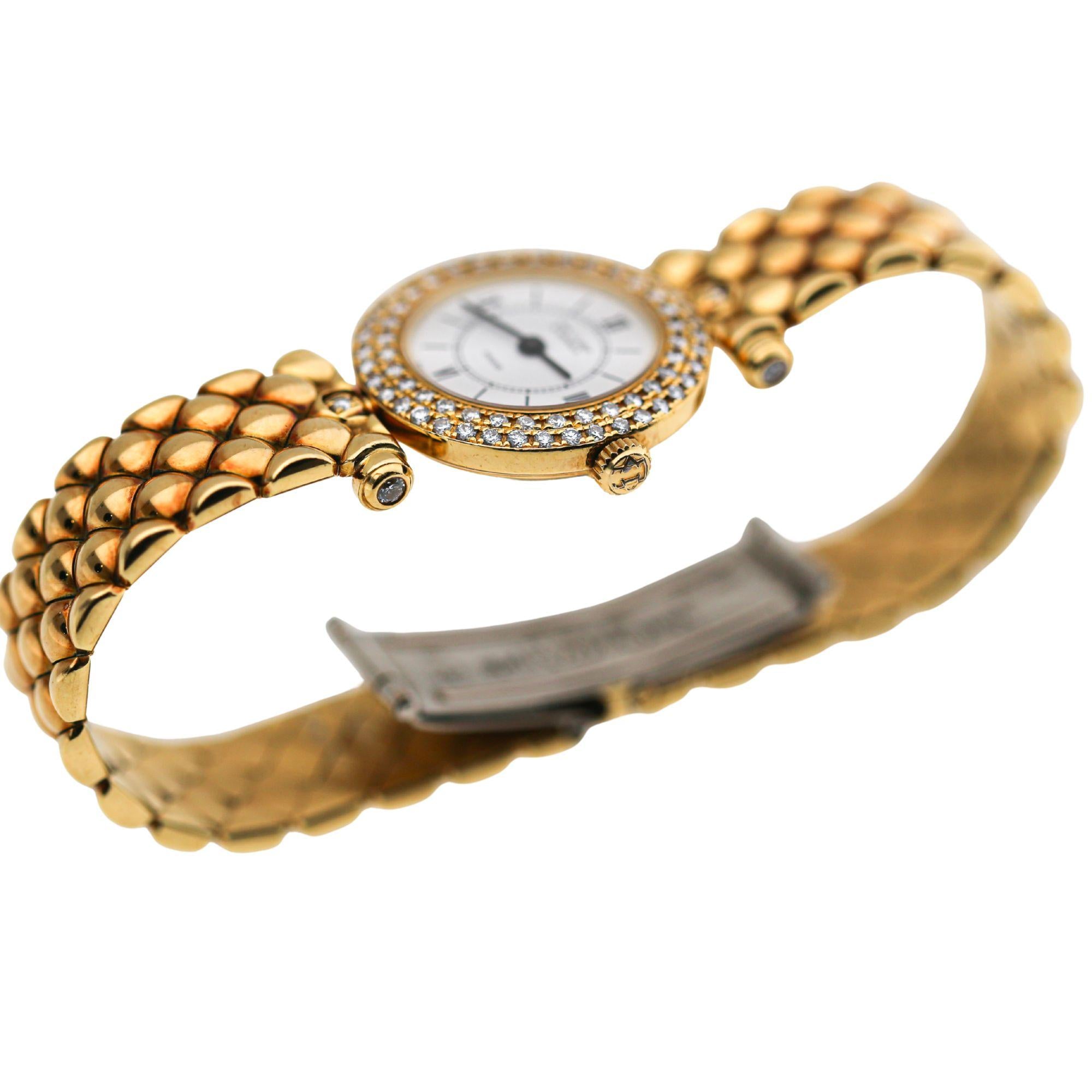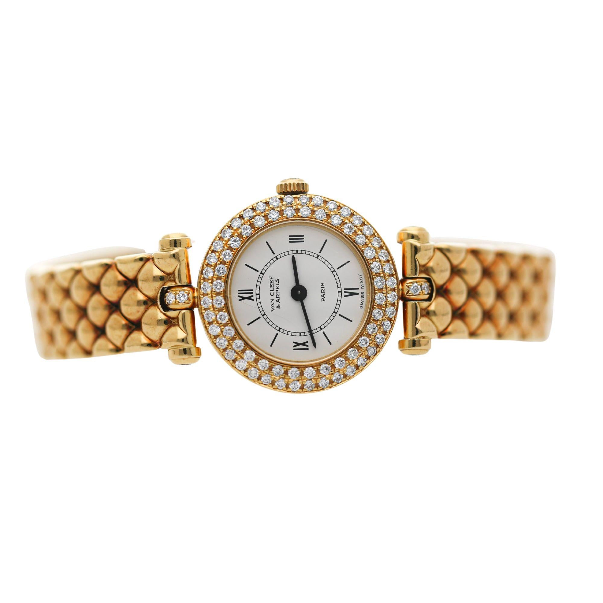 Vintage Van Cleef and Arpels Paris ladies quartz watch in 18K yellow gold featuring a double row diamond bezel and signature quilted scale-pattern integral bracelet. White dial with Roman numerals, Swiss made, reference 18932.