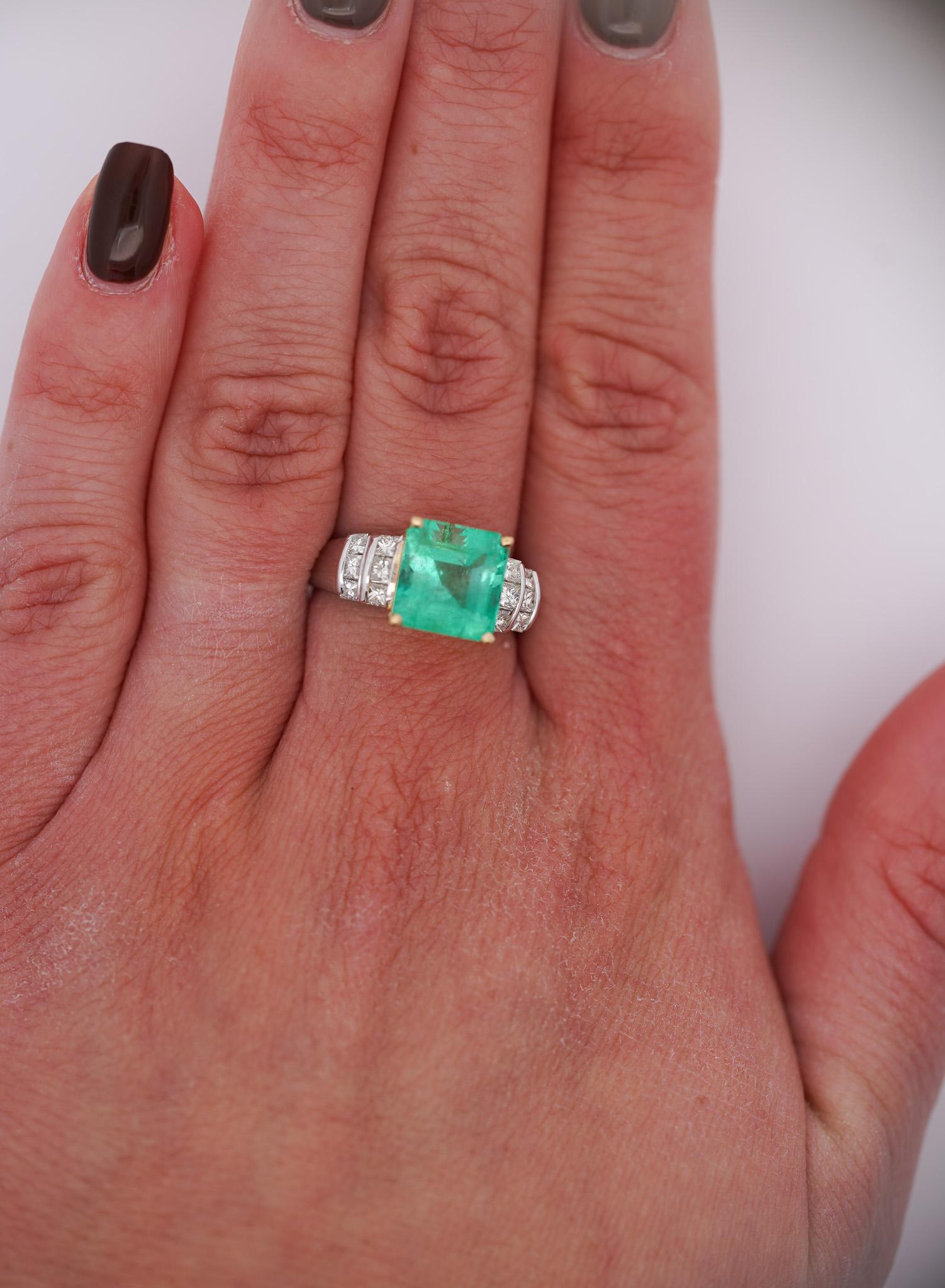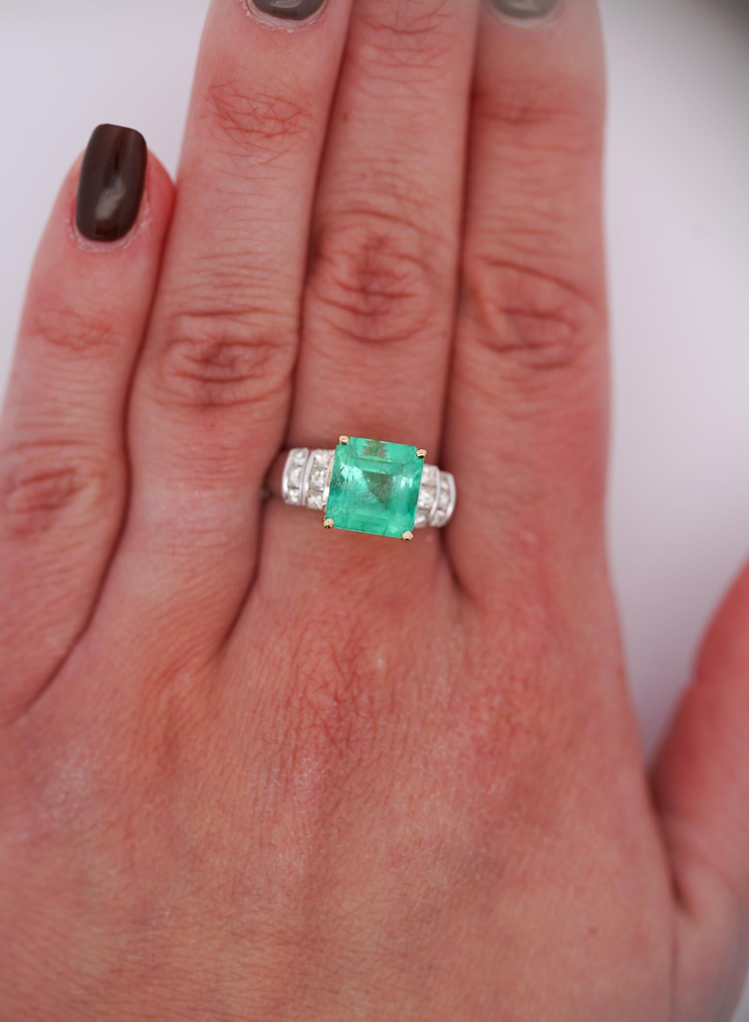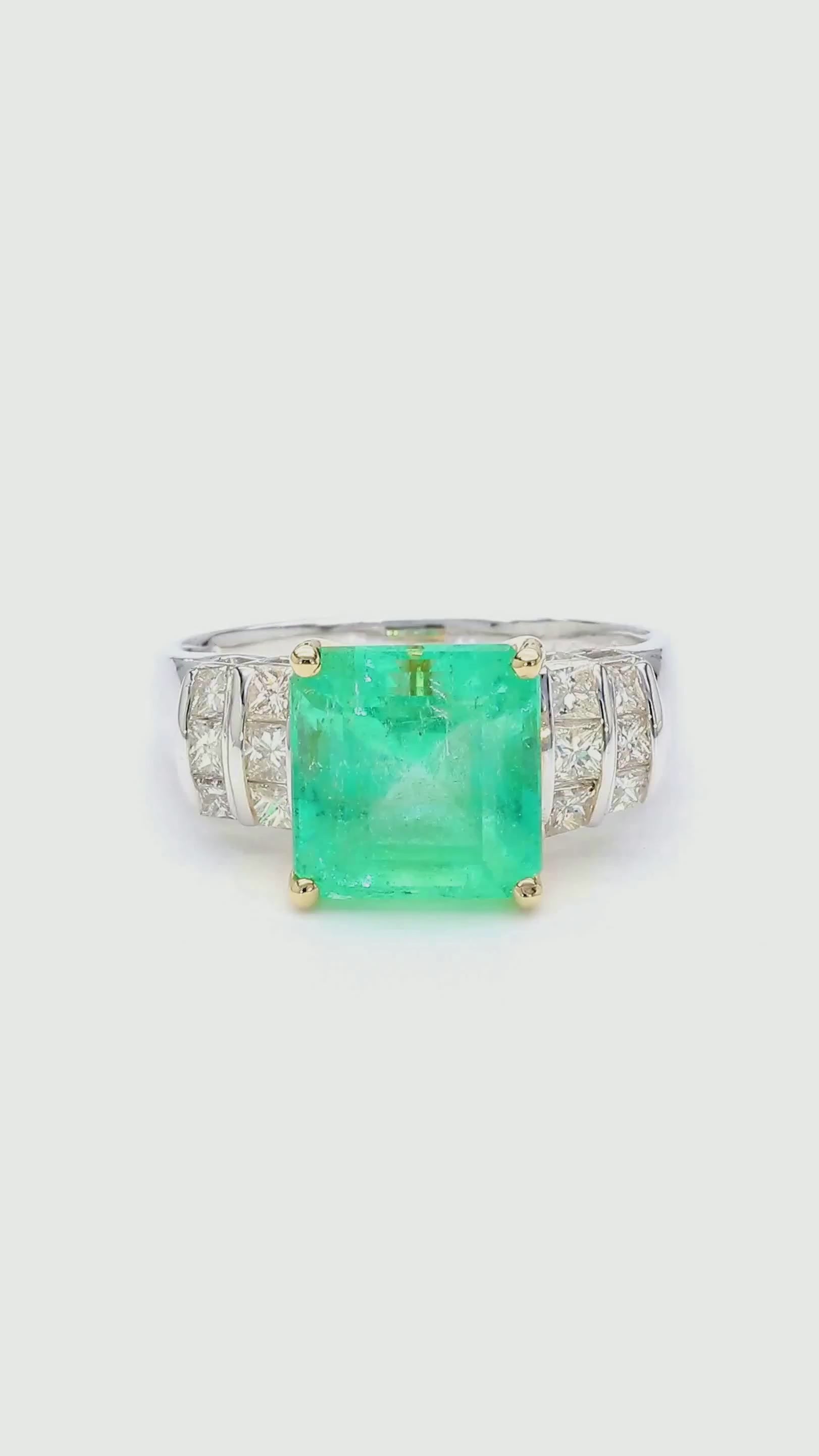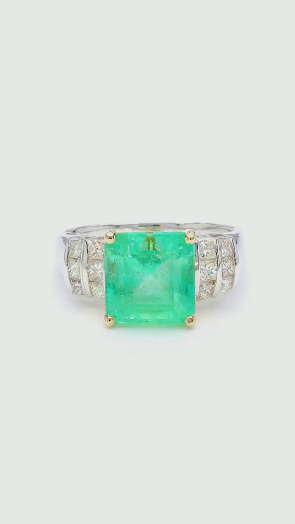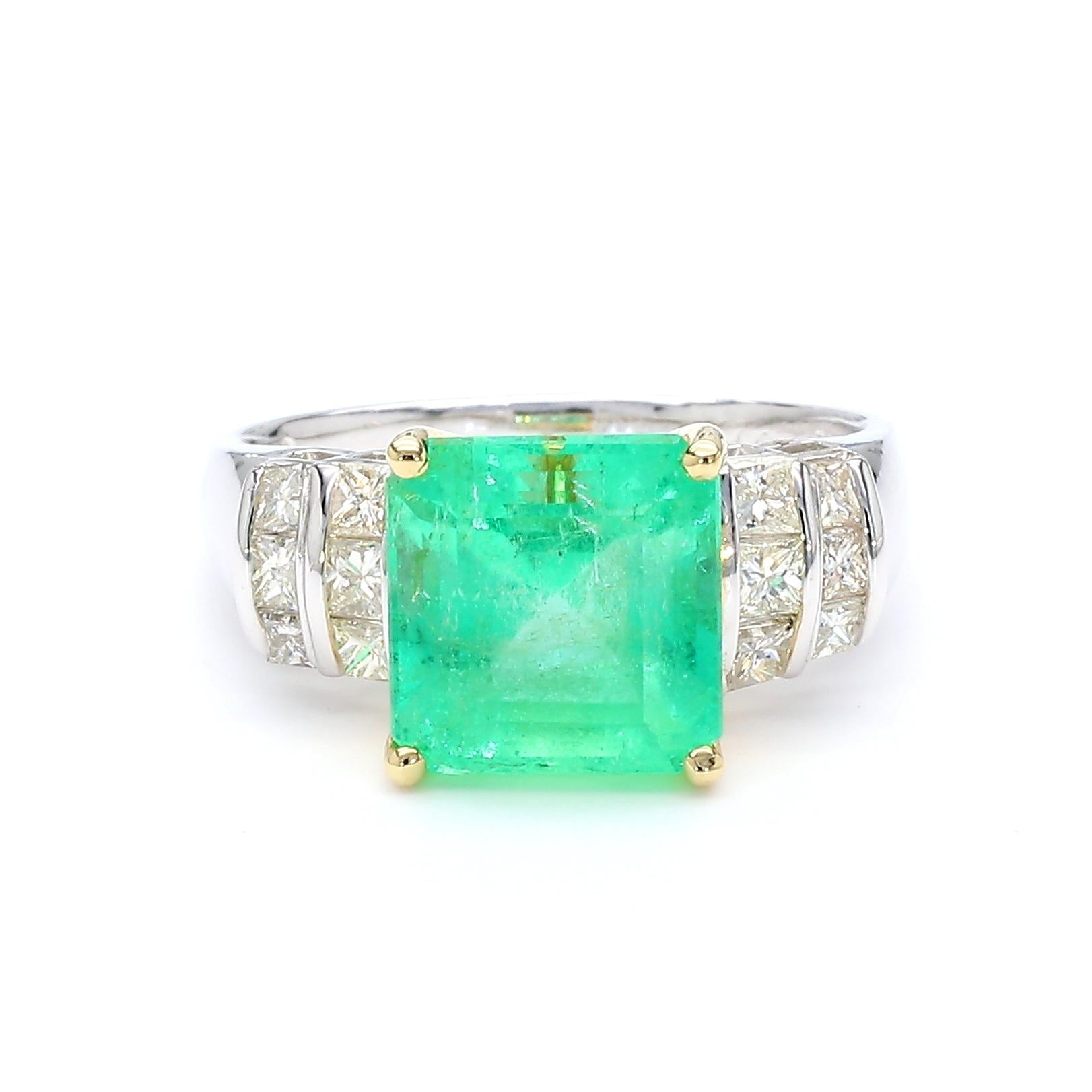 The 4.39 carat emerald cut center stone is a substantial and impressive gem, measuring 9.2 x 8.9mm — nearly square in its proportions — and displaying a bright, vivid light green that is lively and luminous under all lighting conditions. The emerald cut's broad step-cut facets produce sweeping mirror-like reflections of color rather than point brilliance, giving the stone a clean, glassy transparency that showcases the natural character and depth of the emerald. At over 4 carats in an emerald cut with these near-square proportions, this stone has exceptional optical presence on the finger and represents a significant natural gemstone by any market standard. The 12 princess cut diamonds totaling 0.60 carats flanking the center stone provide brilliant white sparkle that frames and amplifies the emerald's color from both sides.