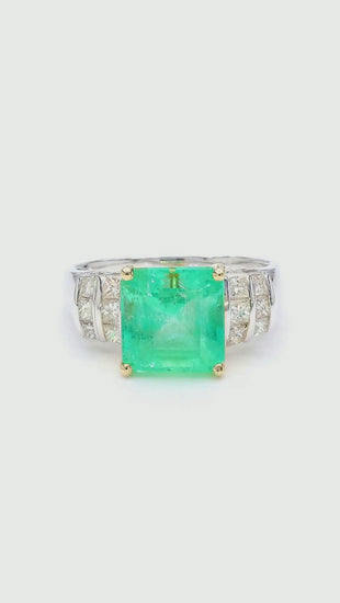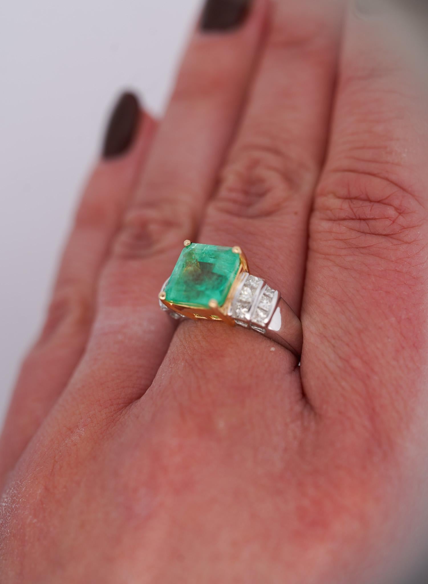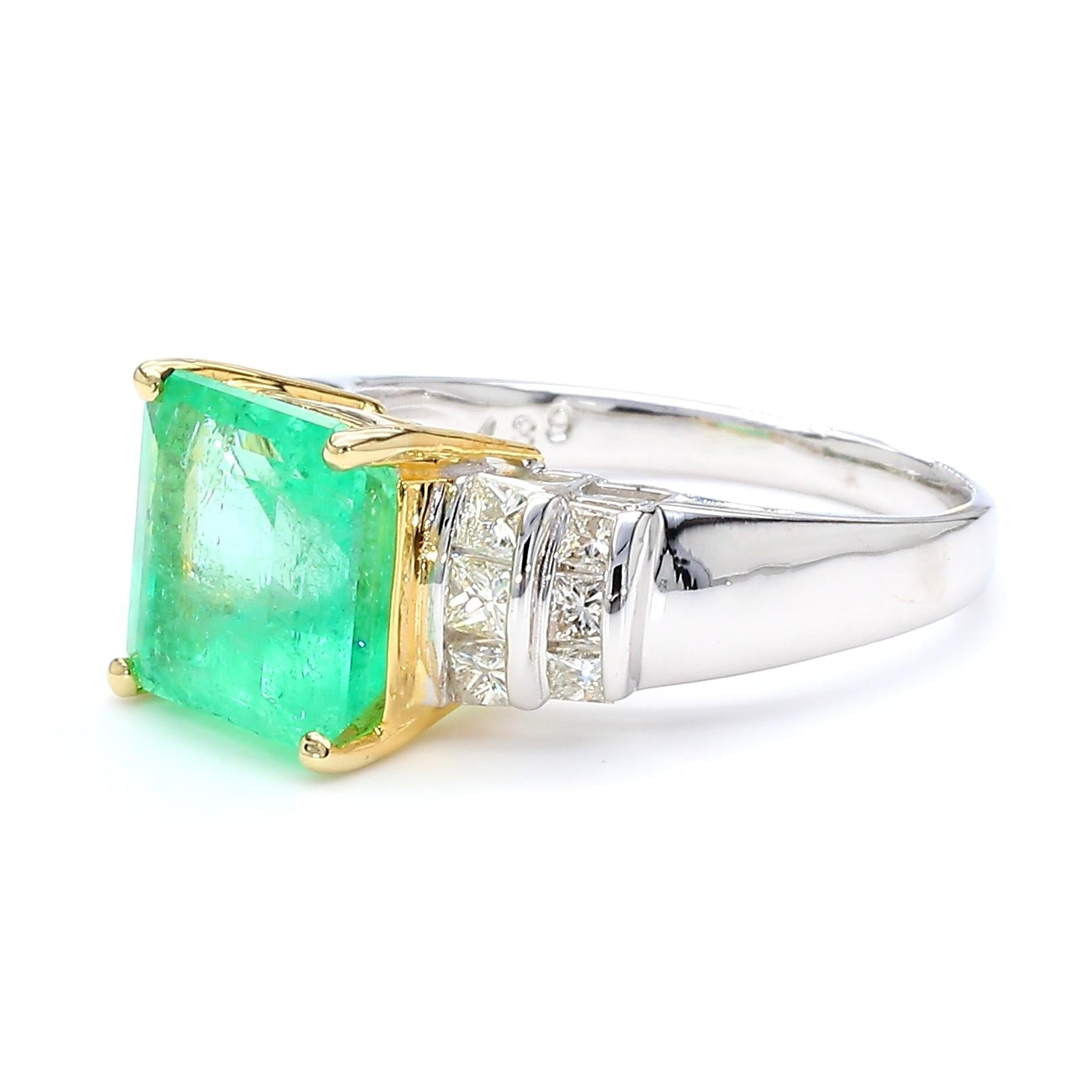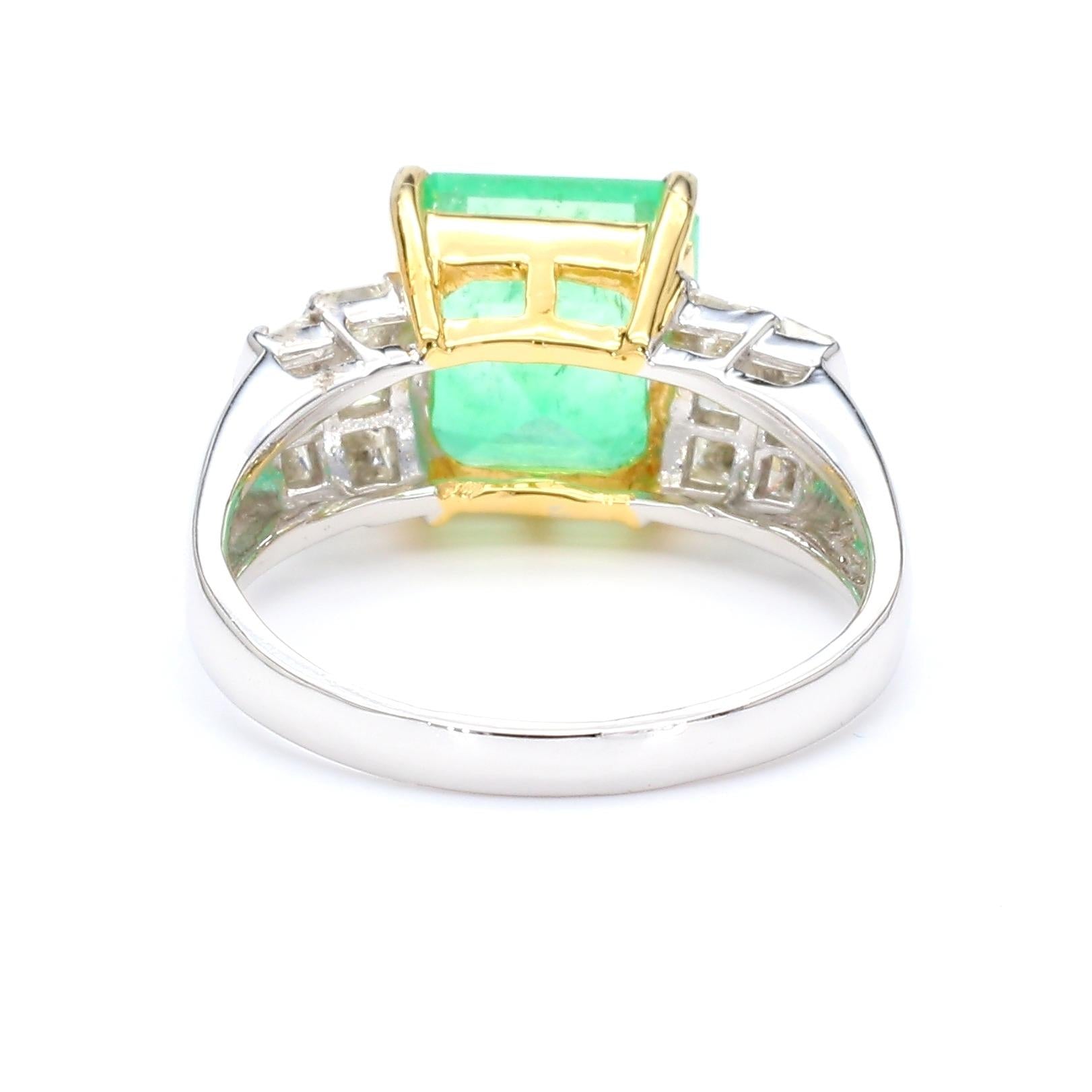 4.39 Carat Emerald Cut Green Emerald & Princess Cut Diamond 18K Two Tone Ring
