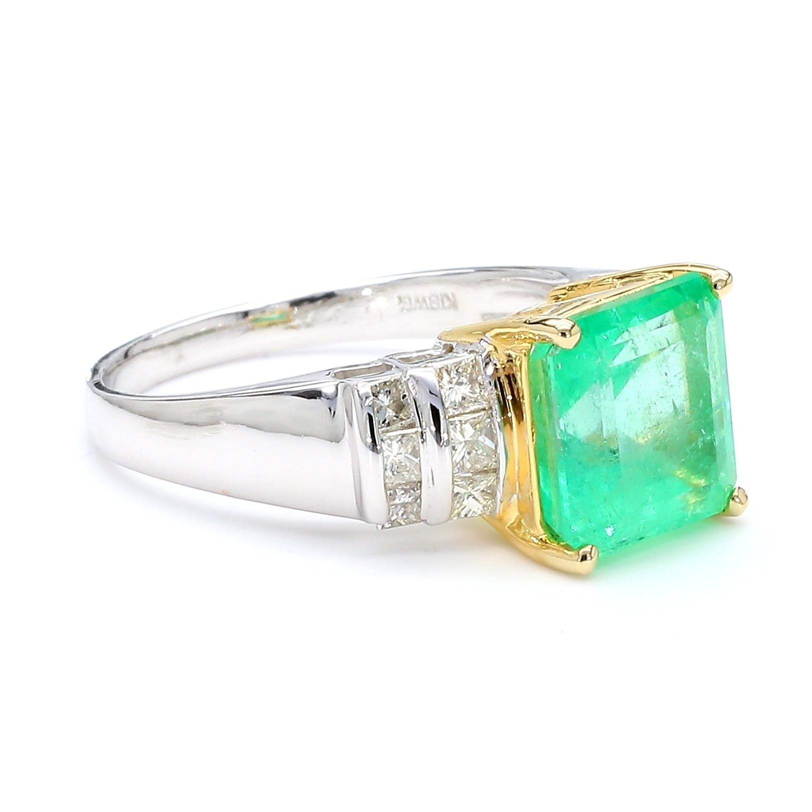 The setting is a refined two-tone design — a yellow gold 4-prong open basket elevates the large emerald cut stone at center, enhancing and warming its vivid light green color, while the white gold shank transitions seamlessly into structured channel-set diamond shoulder mounts on either side that frame the emerald with architectural precision. Each shoulder houses two stacked rows of three princess cut diamonds in a clean channel setting, creating a strong geometric composition that references the step-cut facet structure of the emerald center stone. The contrast between the warm yellow gold prongs and the cool white gold shank and diamond shoulders gives this ring a sophisticated two-tone balance that is both modern and classically fine.