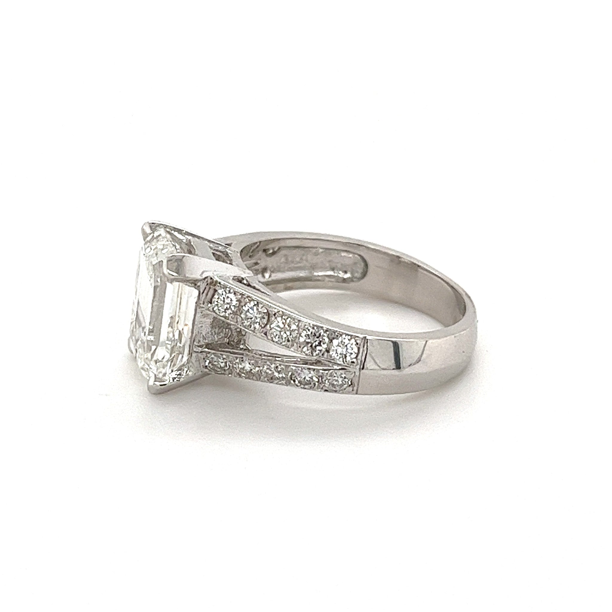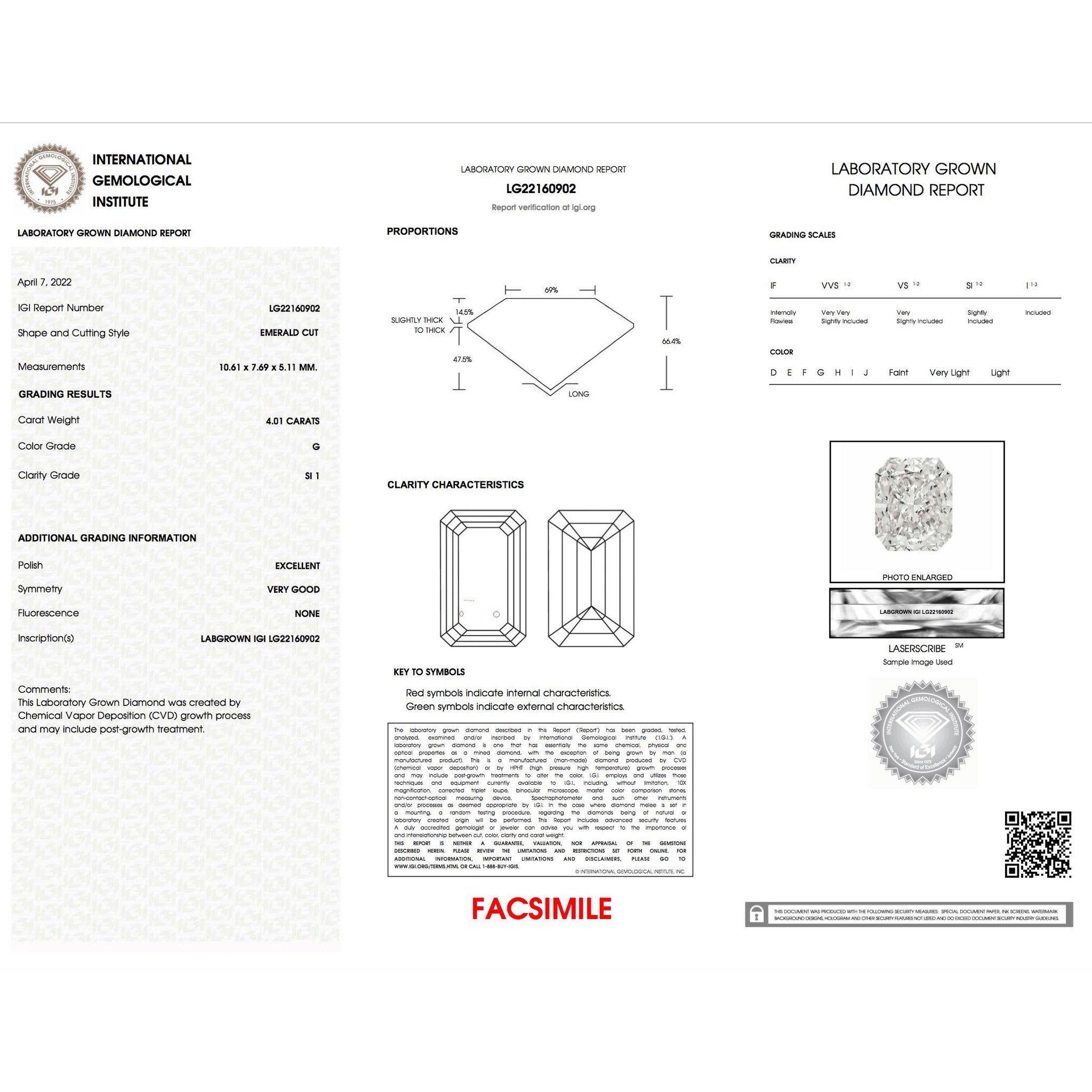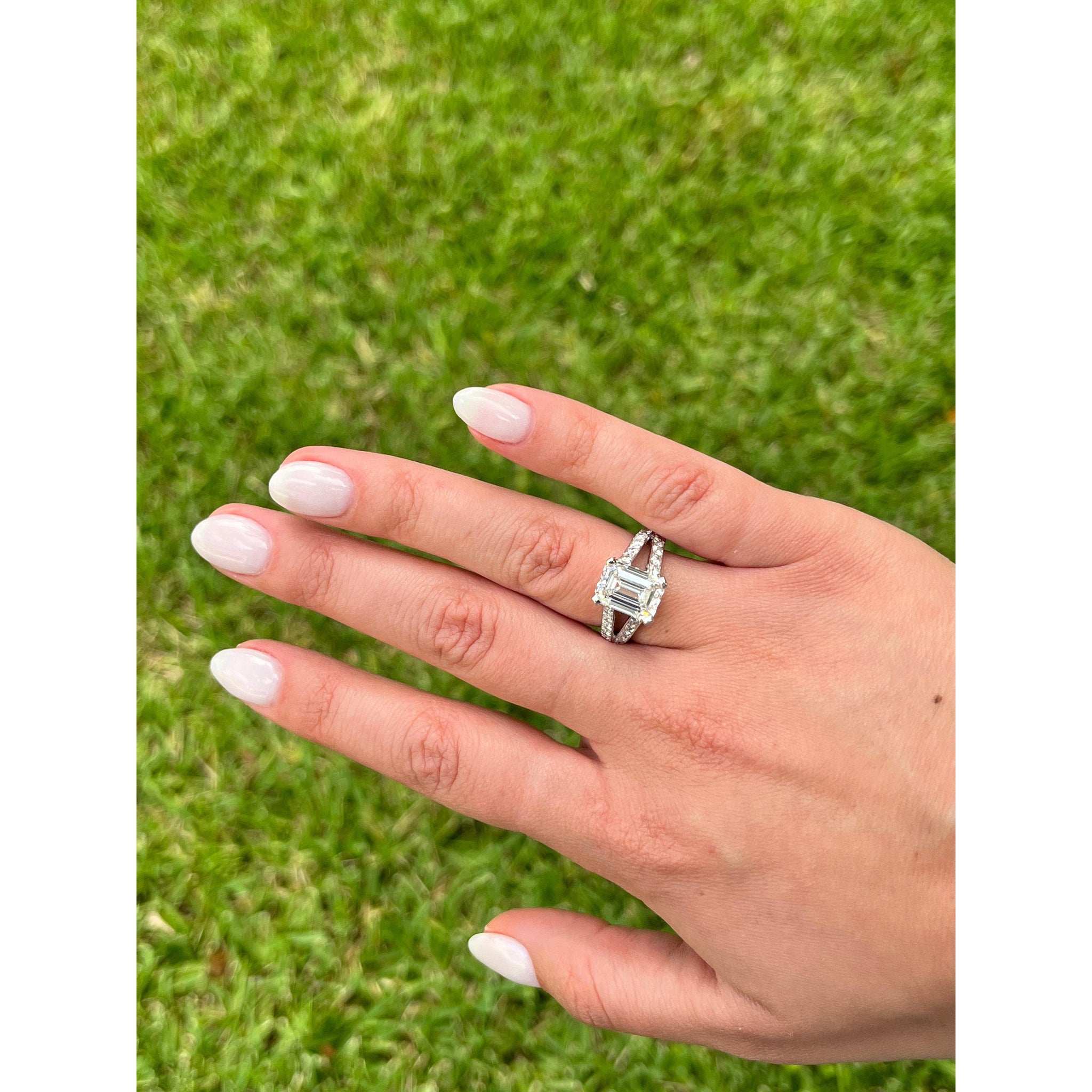 Anillo de compromiso con diamante cultivado en laboratorio de corte esmeralda de 4.01 quilates en oro blanco. 4.01 quilates, corte esmeralda, color G, pureza SI1. La piedra está engastada en un anillo de oro blanco con brazo dividido y piedras laterales de diamante natural con un total de 1.20 quilates.