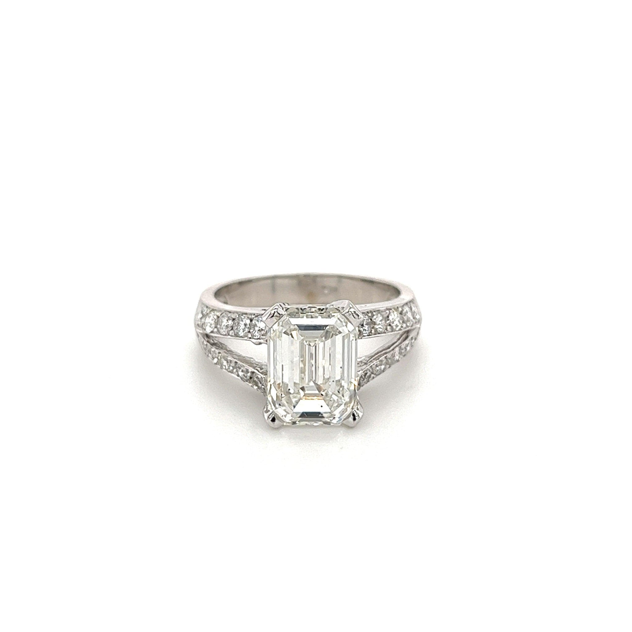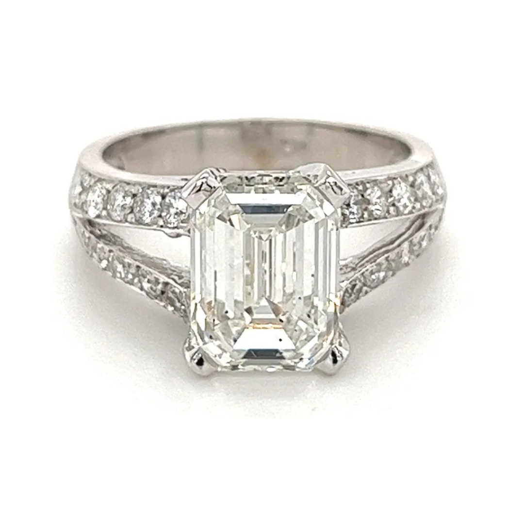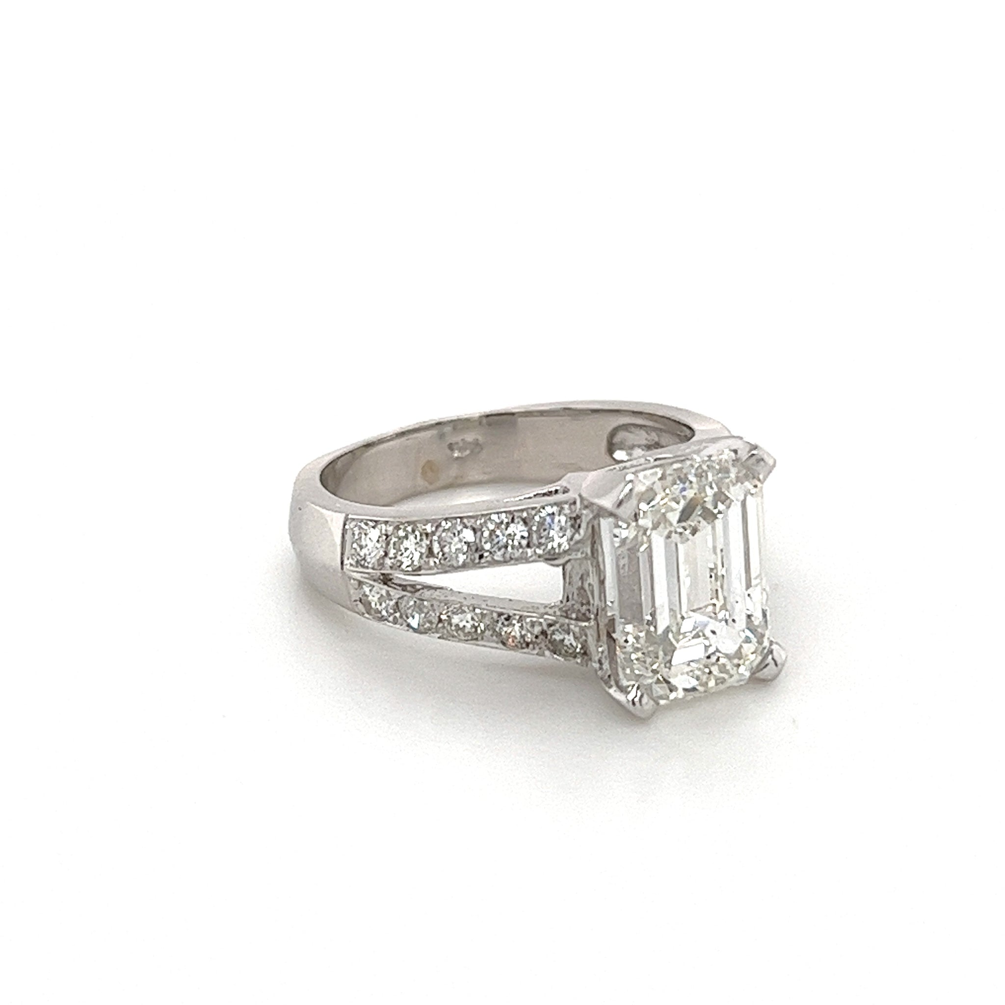 Anillo de compromiso con diamante cultivado en laboratorio de corte esmeralda de 4.01 quilates en oro blanco. 4.01 quilates, corte esmeralda, color G, pureza SI1. La piedra está engastada en un anillo de oro blanco con brazo dividido y piedras laterales de diamante natural con un total de 1.20 quilates.