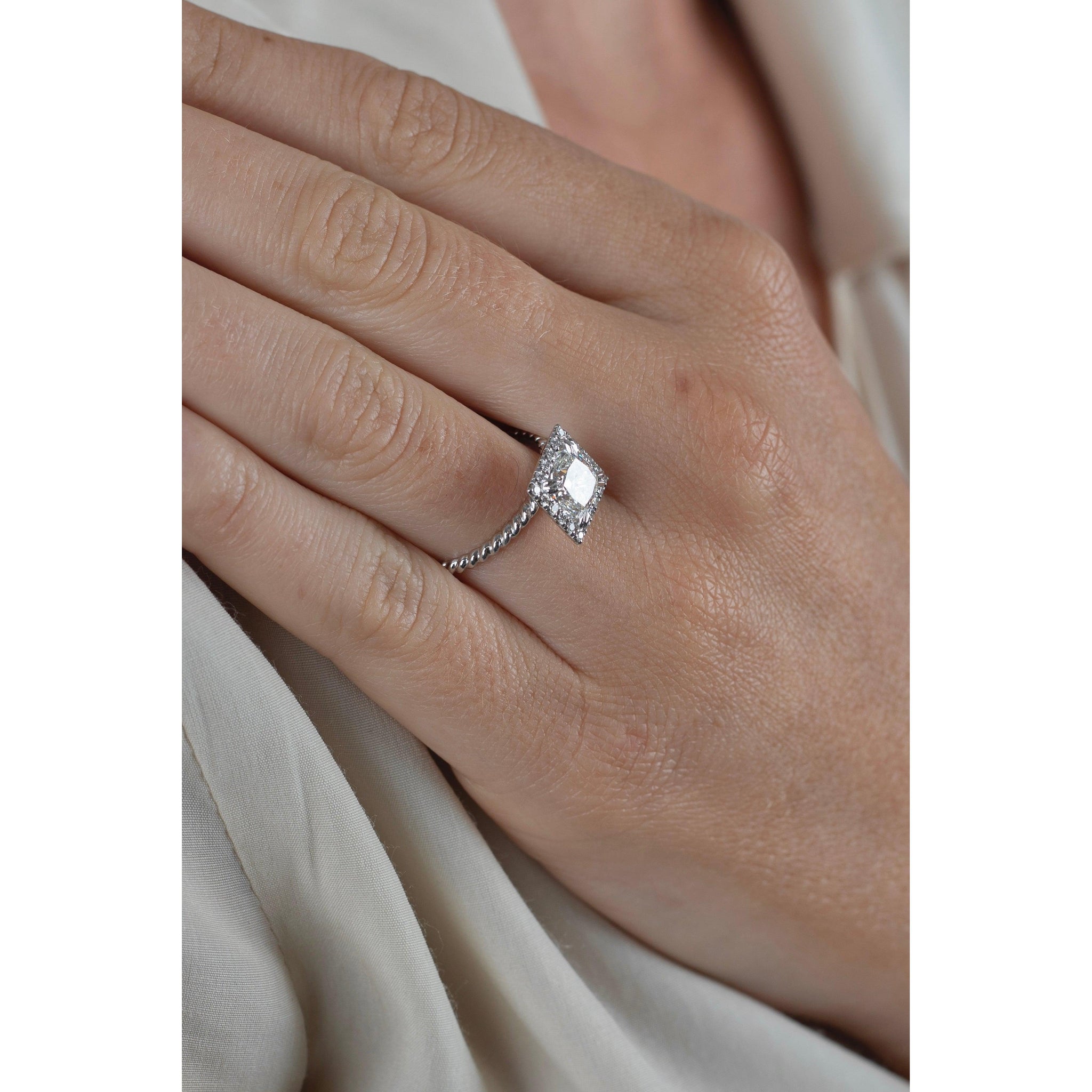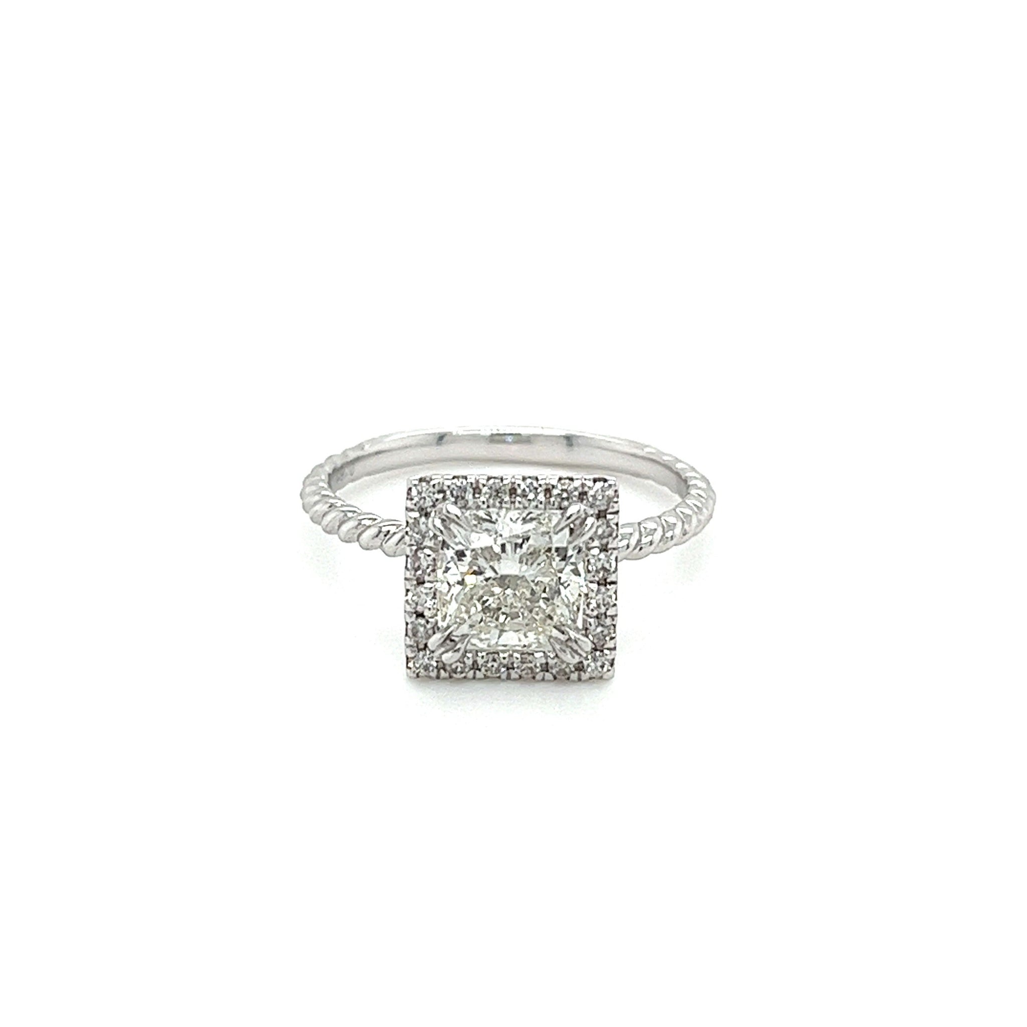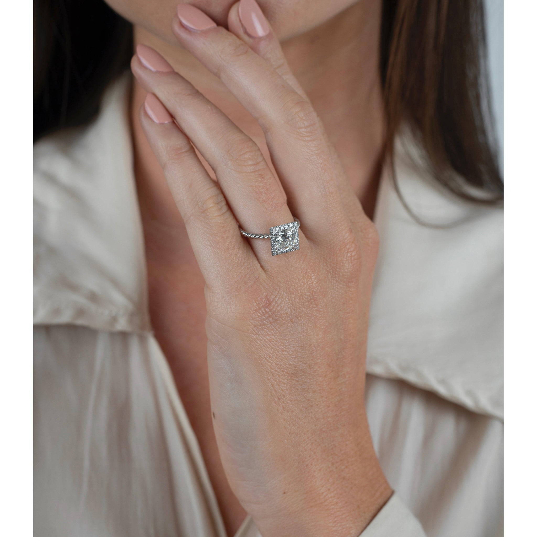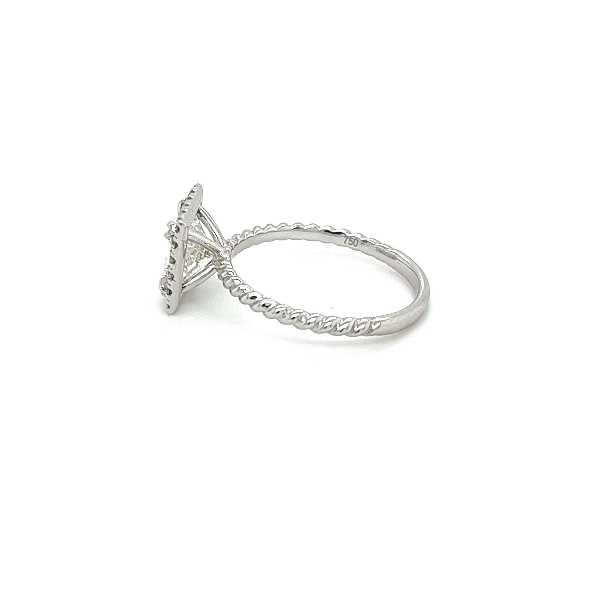 Bague de fiançailles en diamant de laboratoire taille princesse de 1,50 carat avec un halo de diamant taille ronde en forme de carré. Sertie en or blanc 18k, cette captivante bague de fiançailles présente un design de chaîne en corde artistique sur le jonc, élégamment incurvé pour offrir un contraste fascinant avec la pierre centrale taille princesse, nette et symétrique. Avec son allure sophistiquée et son artisanat exceptionnel, cette bague est un symbole inoubliable d'amour et d'engagement, prête à captiver les cœurs pour des générations.
