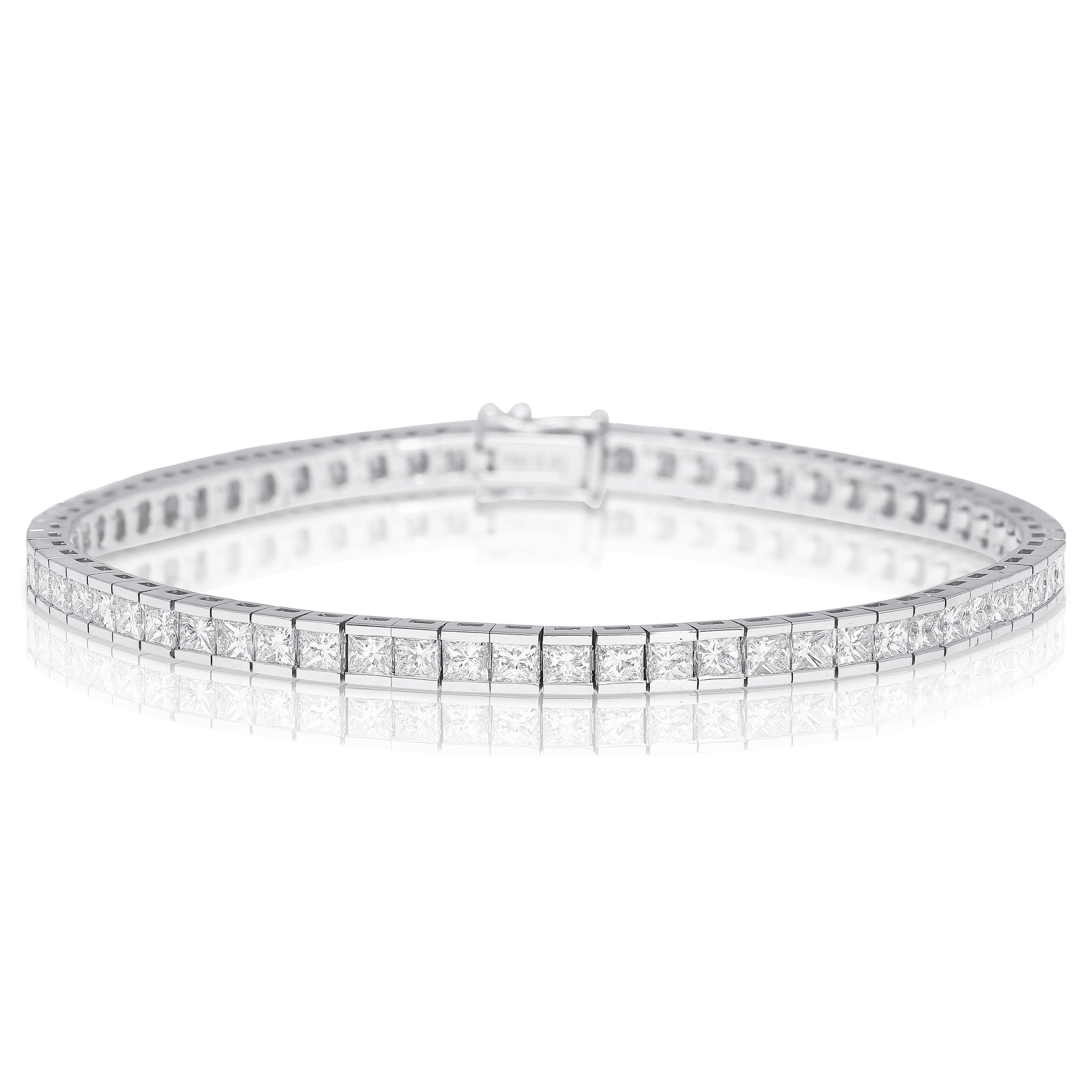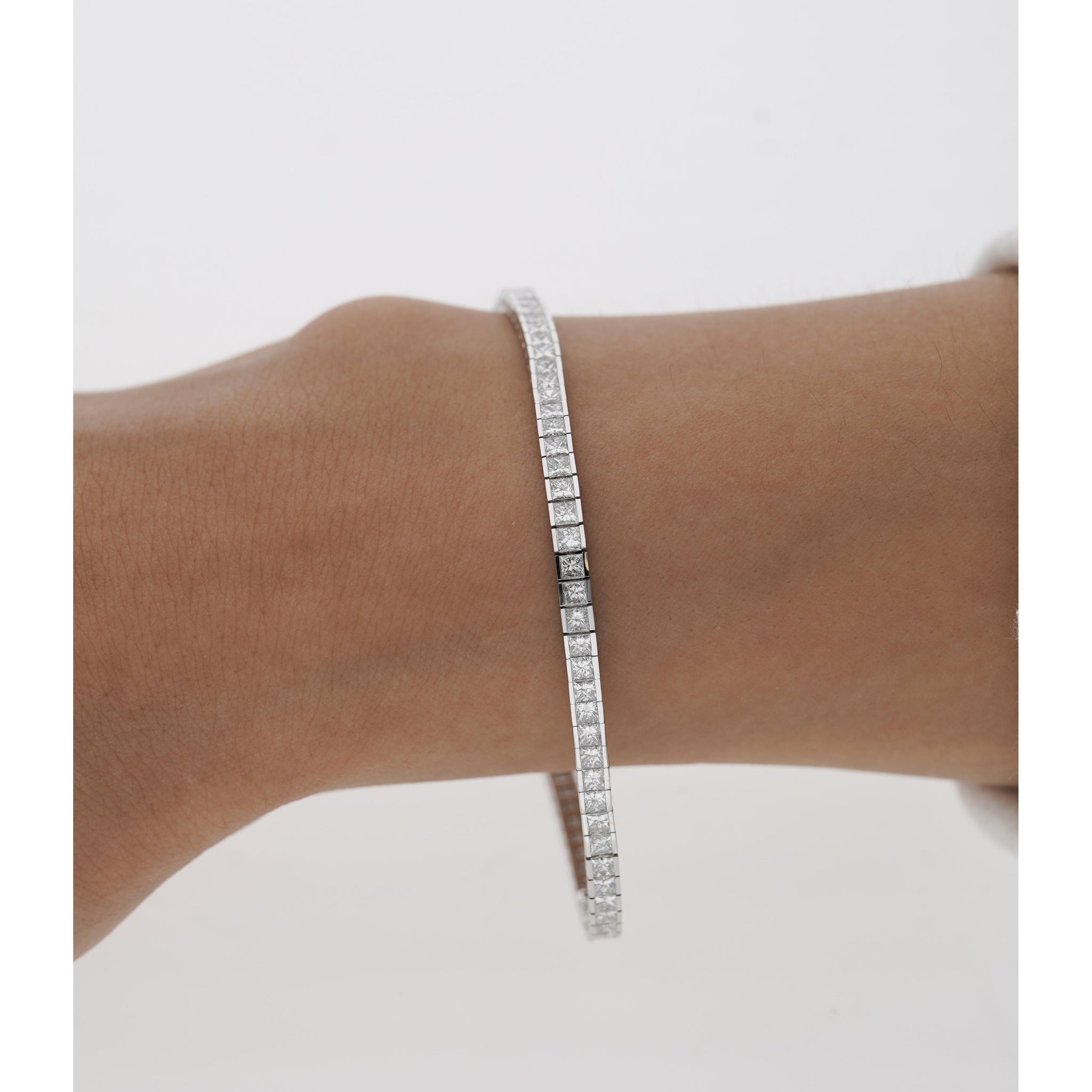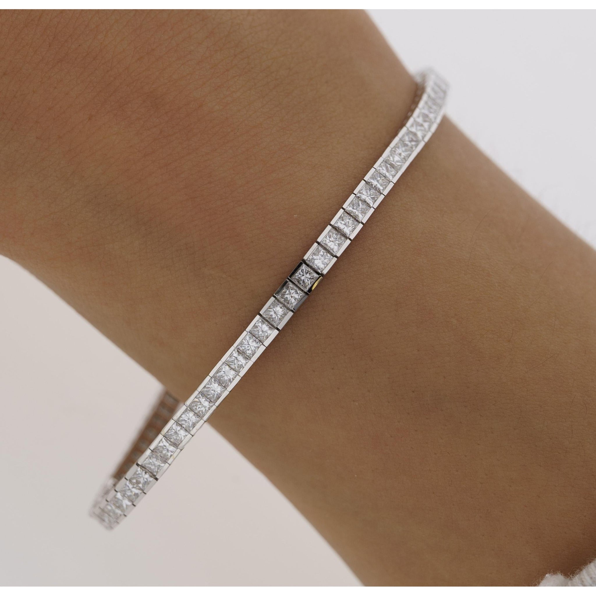 Ce bracelet tennis unisexe présente une série de 80 diamants blancs taille princesse. Les diamants ont un poids total de 4,70 carats. Ce bracelet dispose d’un serti demi-clos et en rail, ainsi que d’une fermeture boîte sécurisée. L’ensemble est monté sur un bracelet en or blanc 18k. Idéal pour hommes et femmes.
