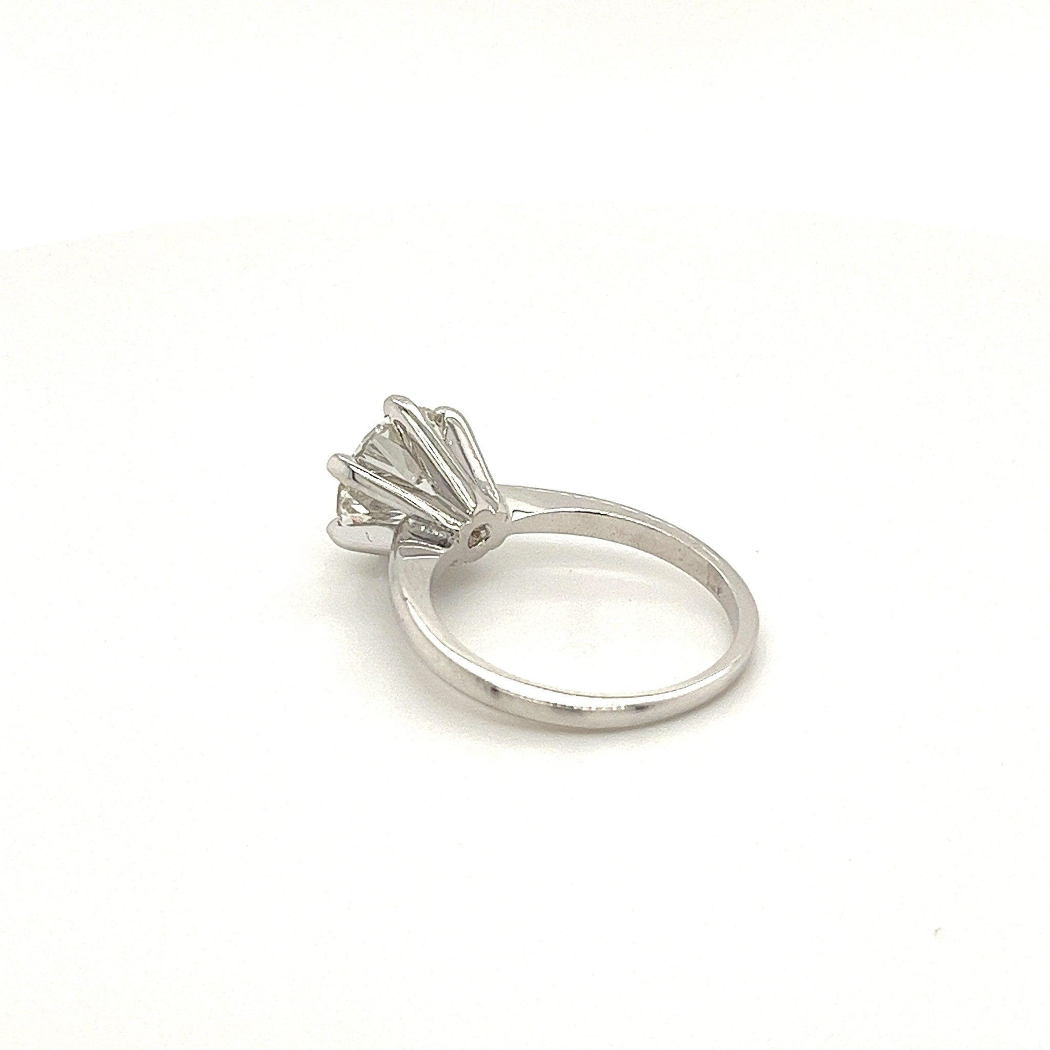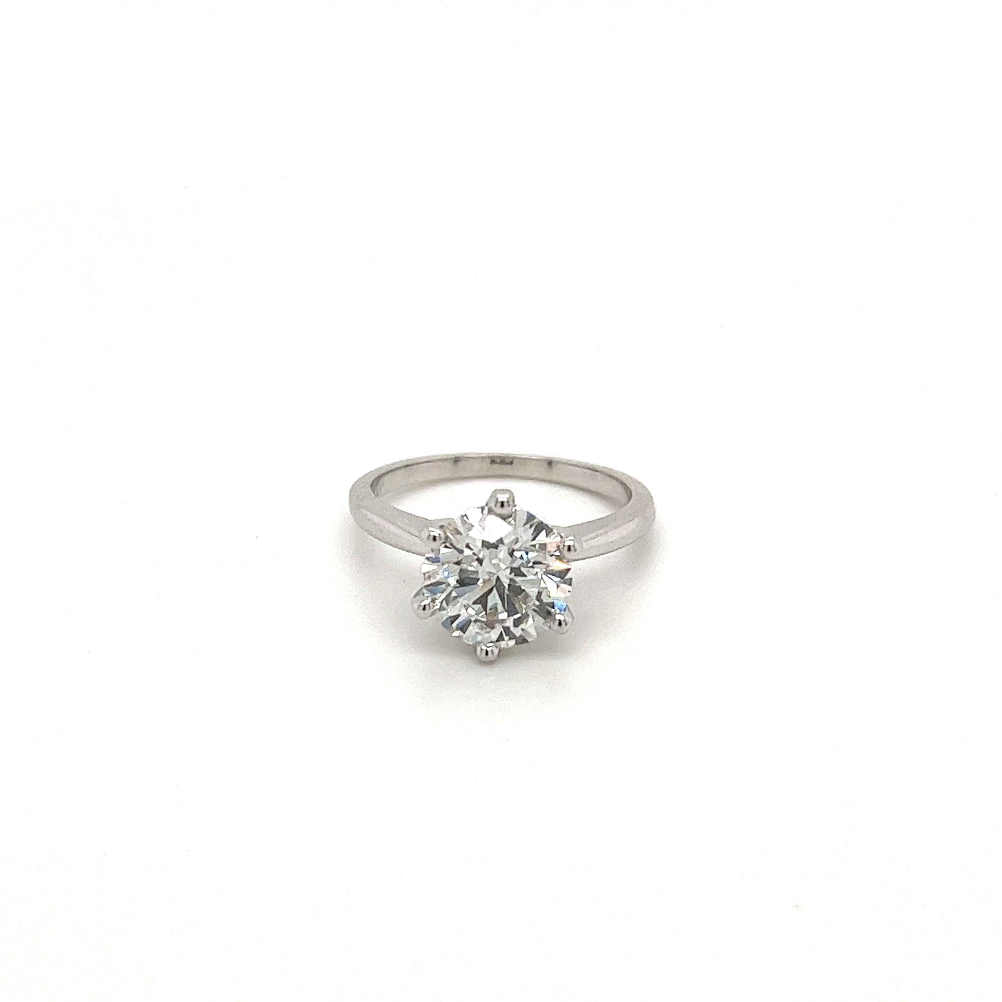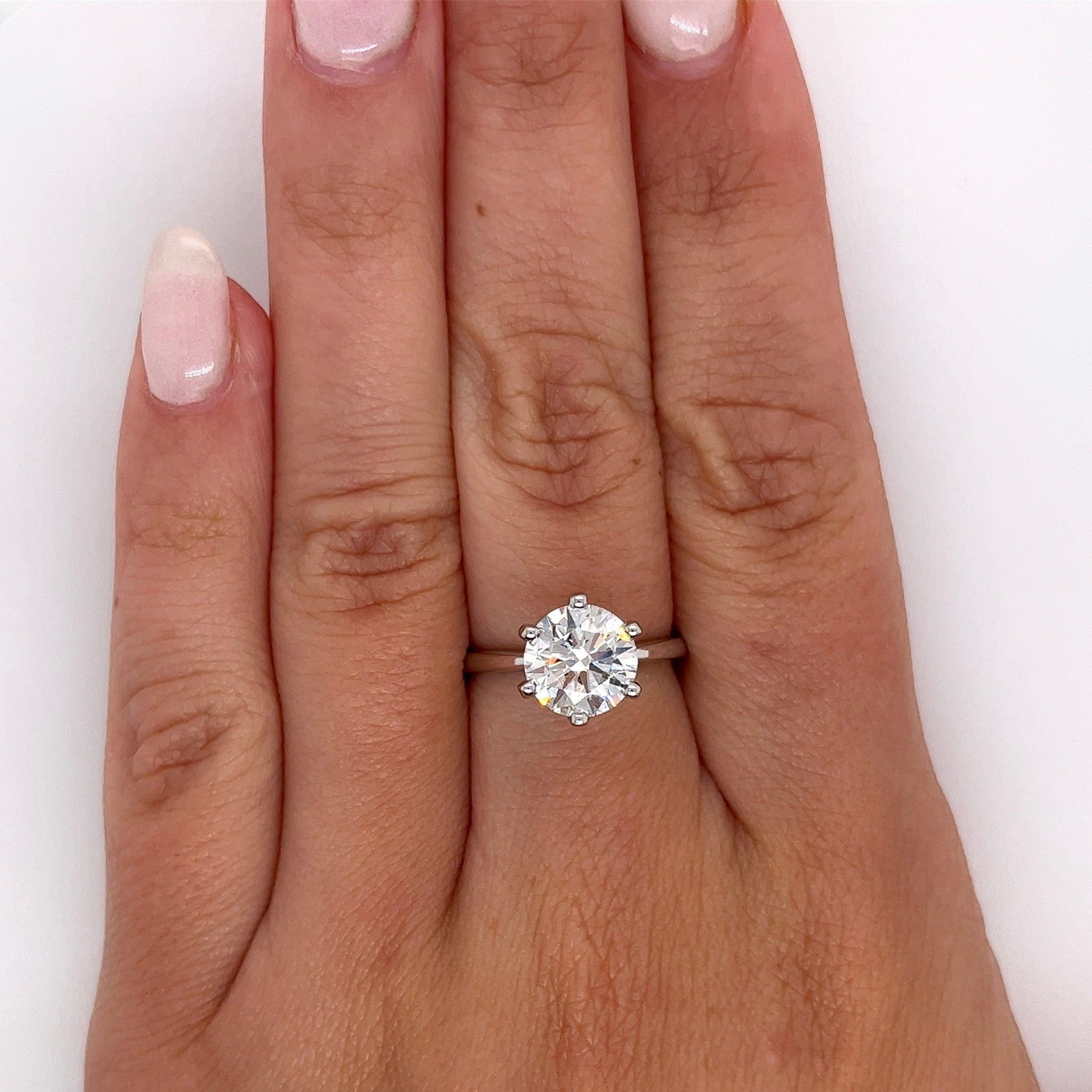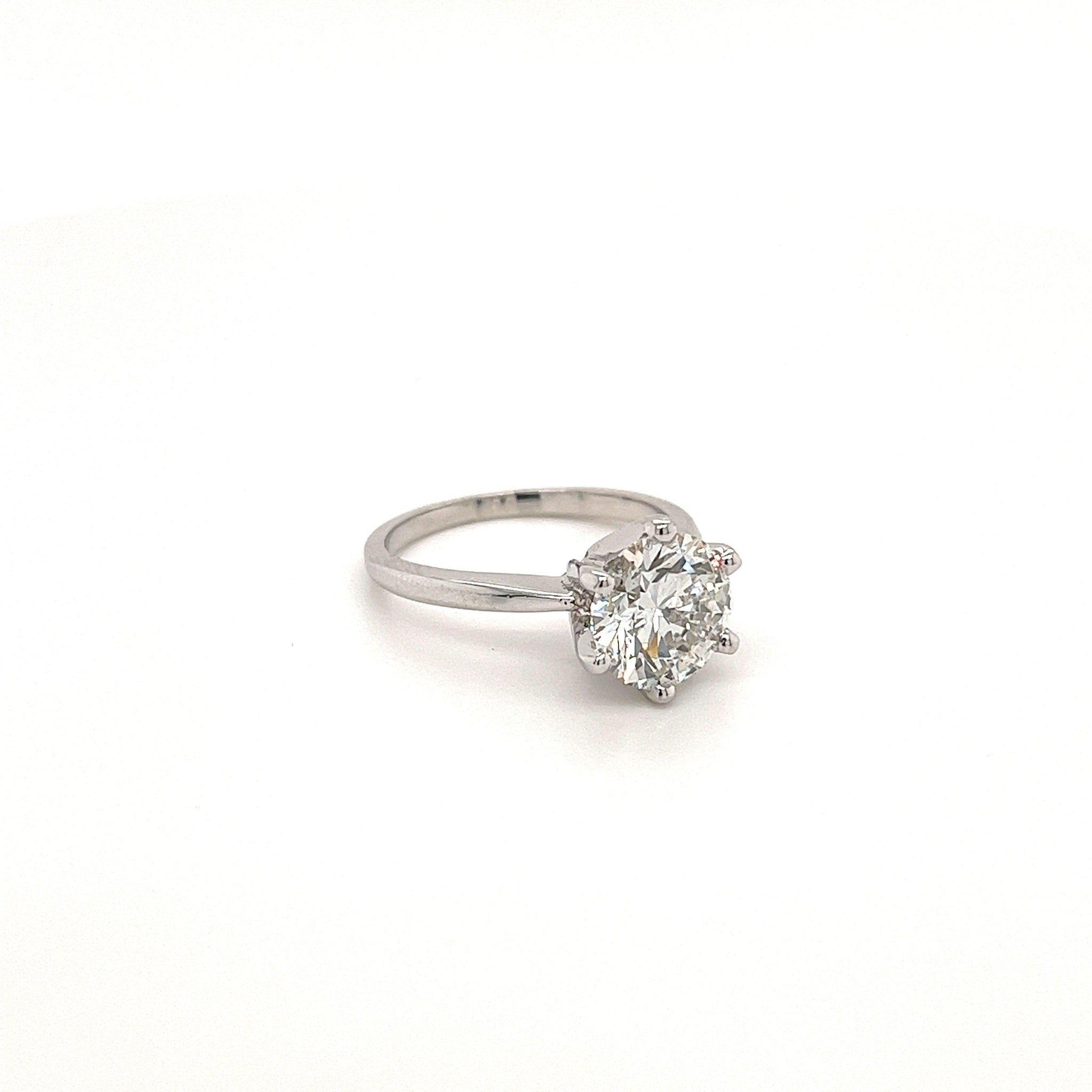 Bague de fiançailles en diamant CVD de laboratoire, certifiée IGI, 2,26 carats, couleur G, clarté VS2, taille ronde idéale. Sertie dans un montage à couronne à 6 griffes en or blanc 14 carats. Le sertissage à 6 griffes offre une excellente couverture sur le doigt et un aspect plus grand pour la pierre centrale. Fixée avec des griffes à pointe sphérique pour garantir que la bague ne se coince jamais dans vos cheveux ou vos vêtements.