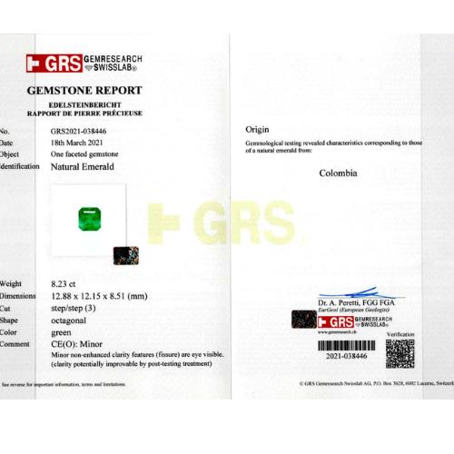This 8.23 carat emerald displays the rich, saturated green color characteristic of fine Colombian emeralds. The emerald cut features parallel step facets that showcase the stone's color depth and transparency rather than brilliance. Measuring nearly 13mm square, this gem commands attention with its substantial size and vivid hue.