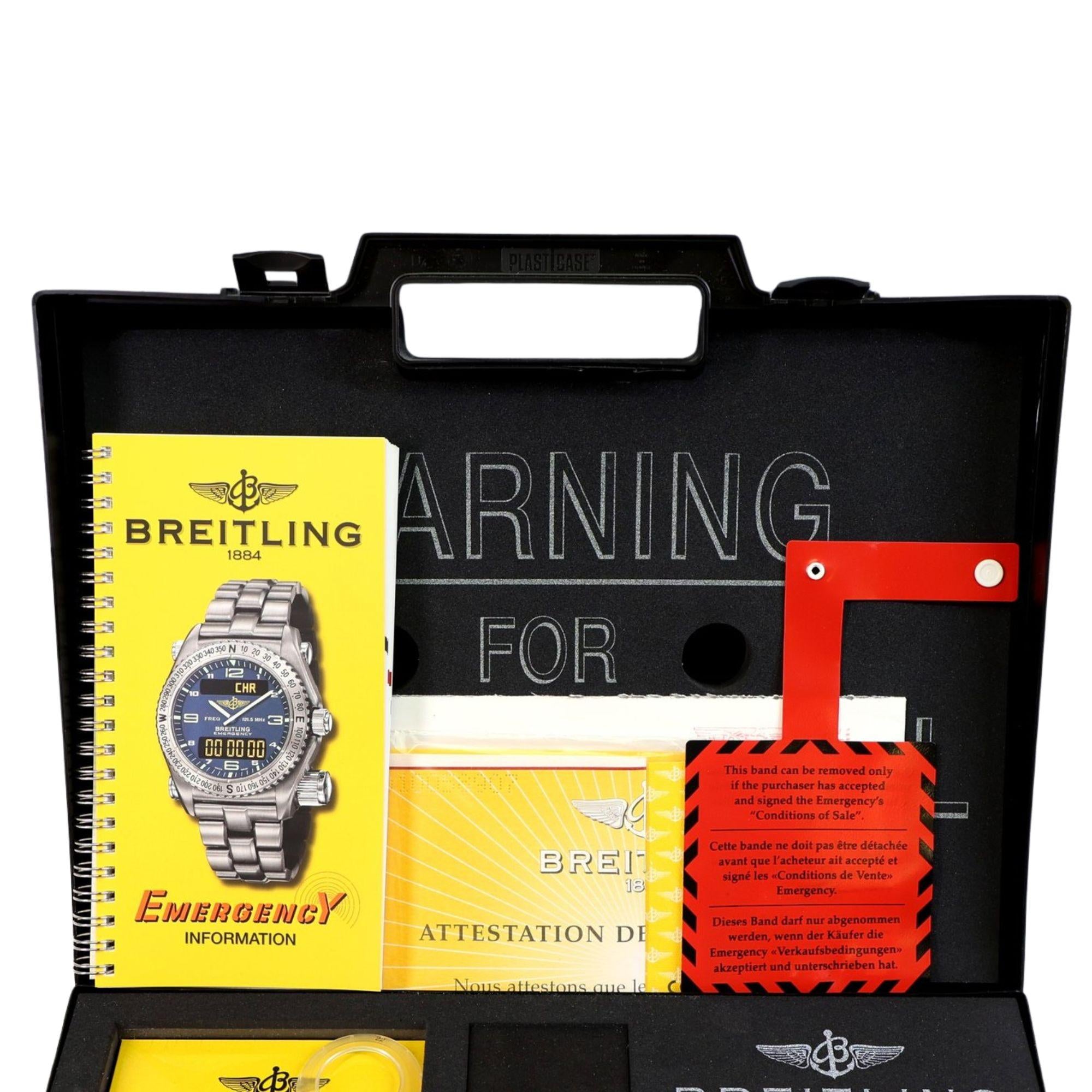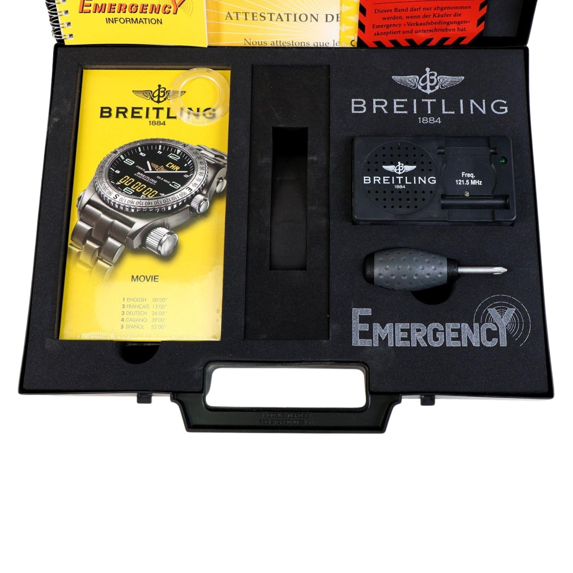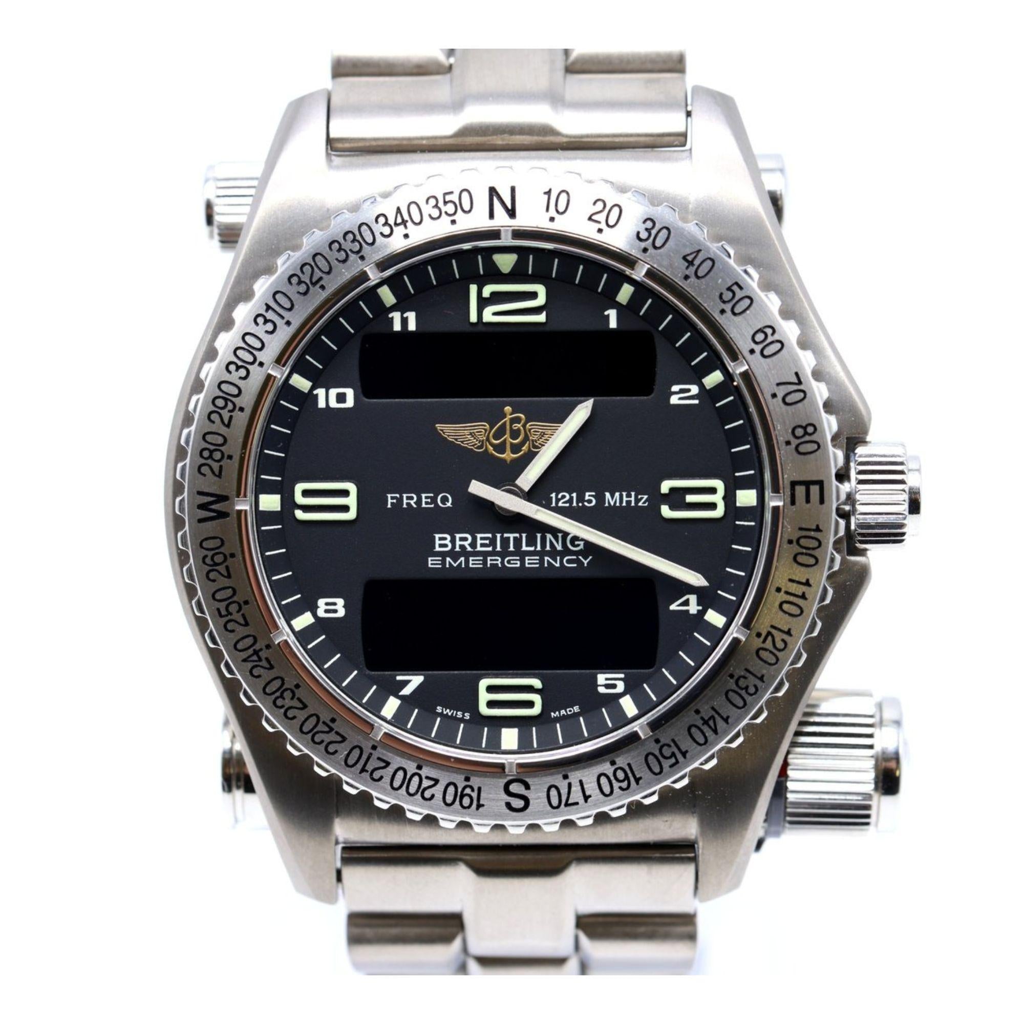 Breitling Emergency quartz analog-digital wristwatch in titanium featuring 43mm case with integrated 121.5 MHz emergency distress transmitter and black dial with luminous Arabic numerals. Reference E56321, bidirectional compass bezel, dual digital displays, titanium link bracelet, water resistant to 3 ATM.