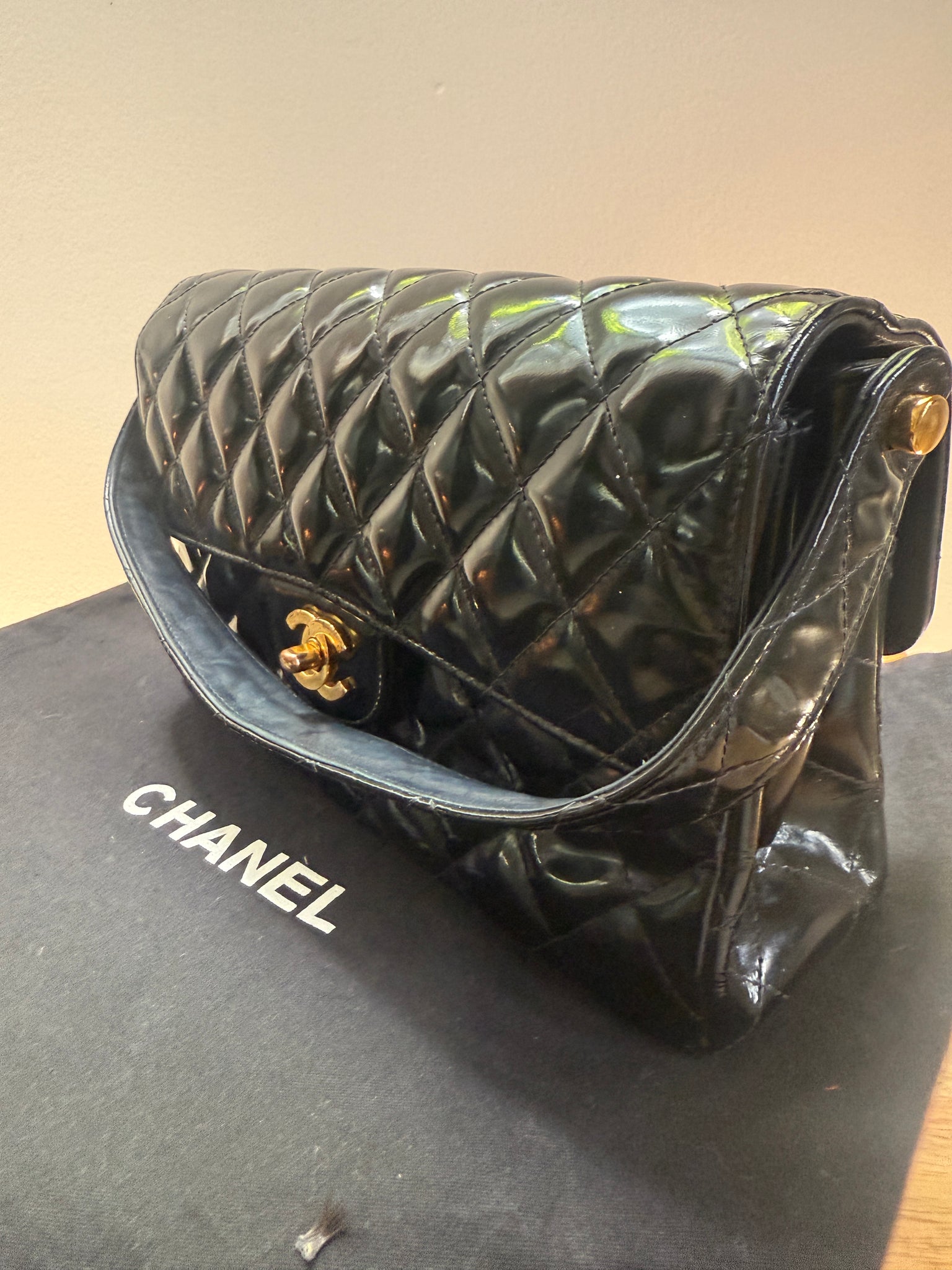 The vintage Chanel patent leather double-sided flap Coco Handle is a rare and highly sought-after piece that combines several iconic Chanel elements into one sophisticated and timeless design.