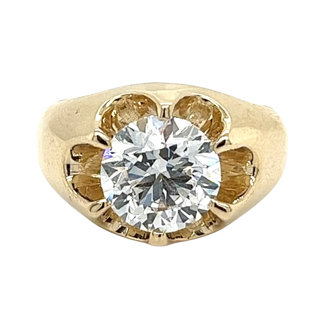 CGL certified 3.35 carat ideal round brilliant cut lab-grown diamond men's ring in 14k solid yellow gold. This solitaire ring features a unique, rounded, and open-style prong mounting. Giving gaps that provide a focus to the vibrant center stone.