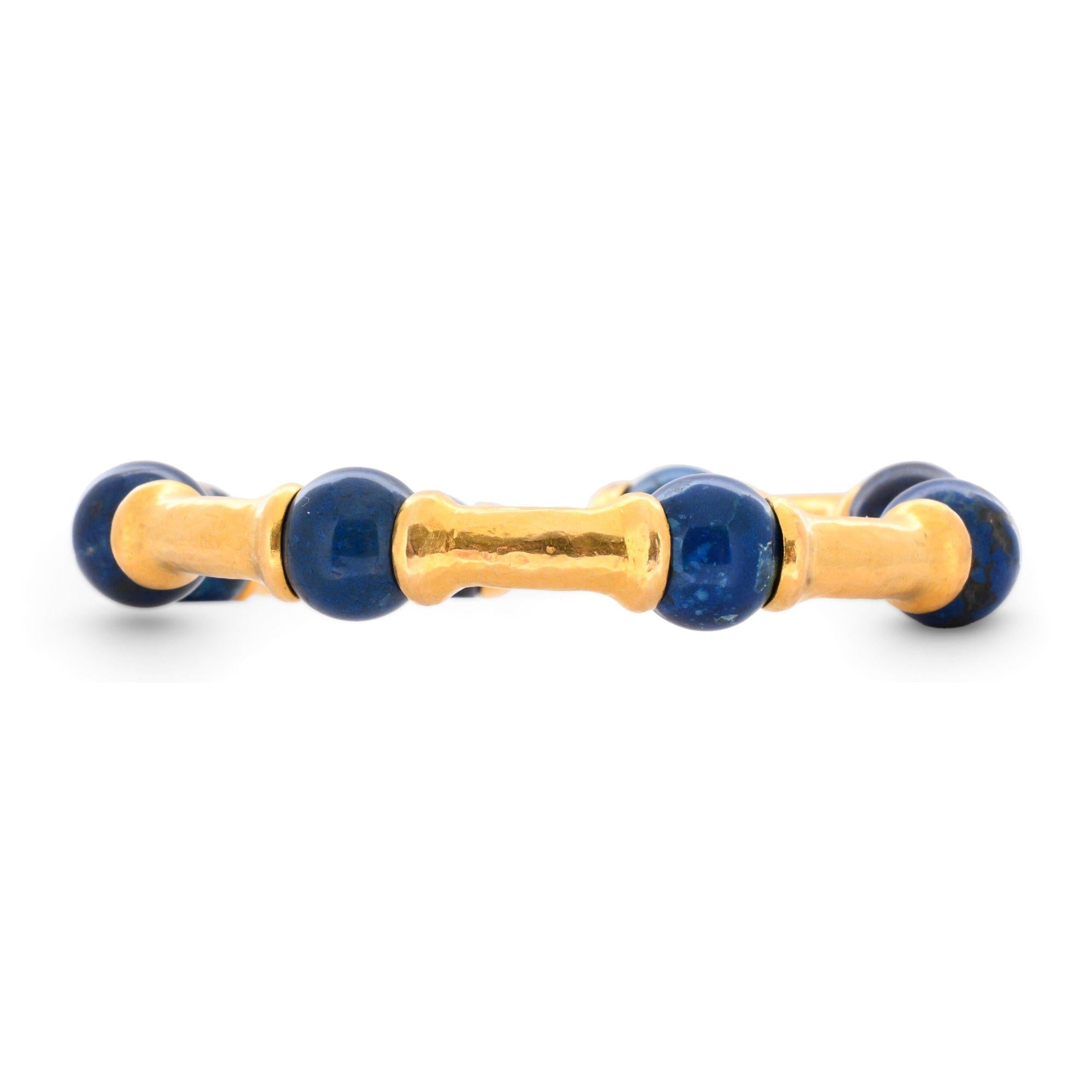 Natural lapis lazuli bead bracelet set in 21K yellow gold featuring alternating lapis beads and curved bamboo-style segments of hammered gold bar segments. Lapis beads measure 11-10.5mm, gold bars measure 5.5mm, total weight 44.95 grams, fits max 7.5-inch wrist.