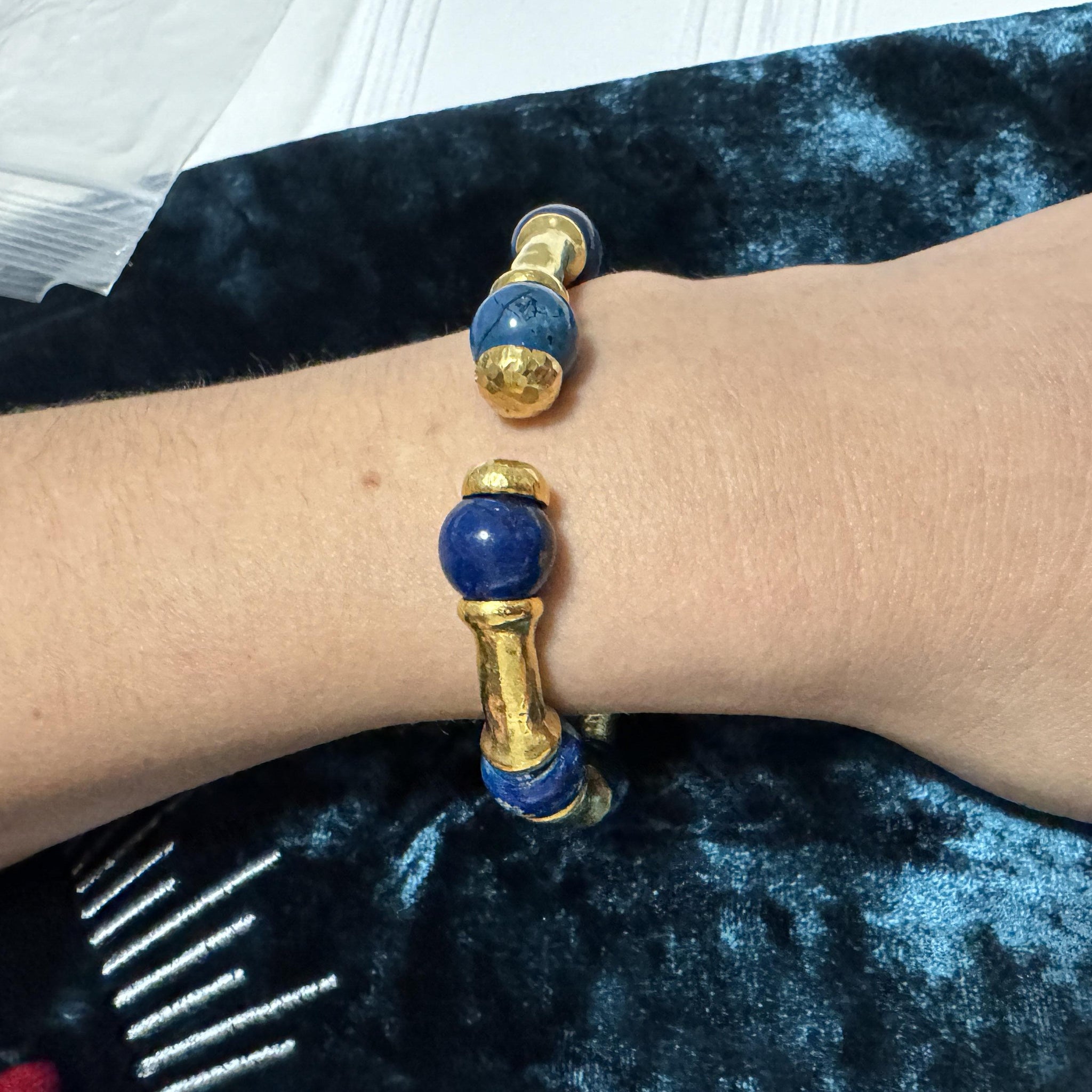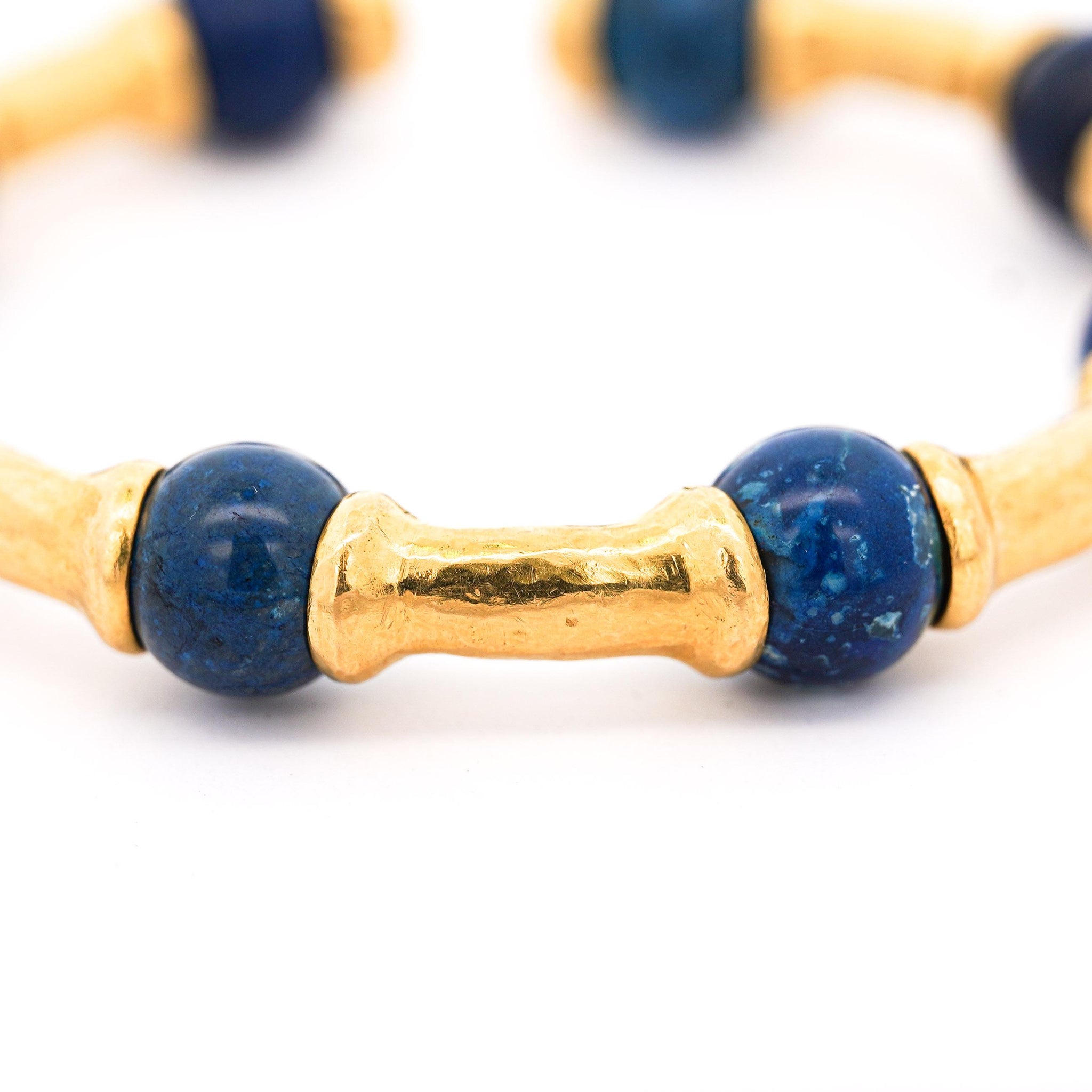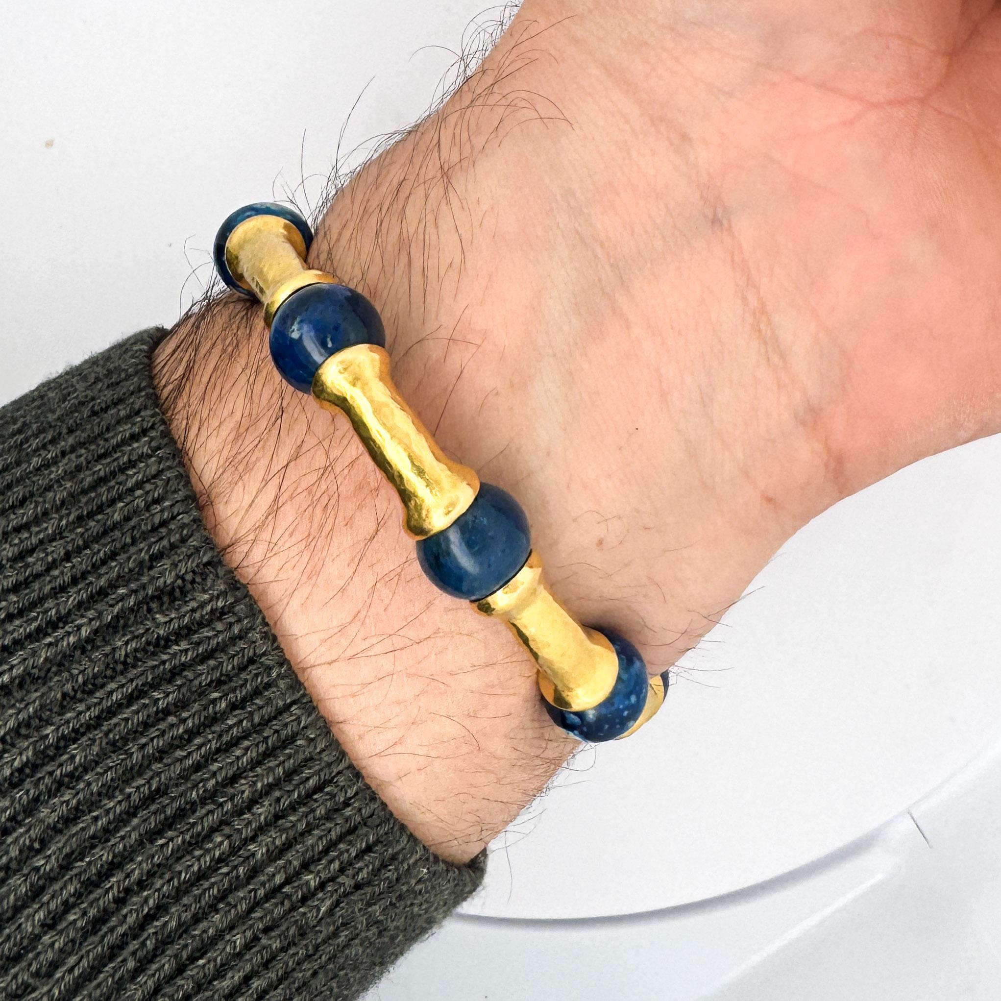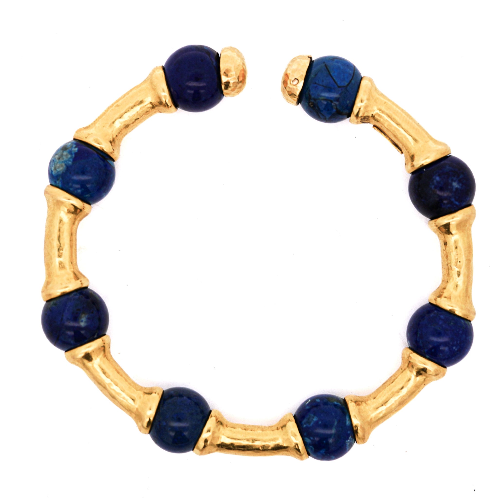 Design & Construction Alternating pattern combines natural lapis lazuli beads with 21K yellow gold bamboo-style bar segments creating rhythmic visual flow. Hammered gold finish provides textural depth and light-catching surface that contrasts with smooth lapis beads. Curved gold bars mimic bamboo segments, adding organic sculptural quality to the design. Deep blue lapis stones feature natural pyrite inclusions creating golden metallic flecks throughout. At 44.95 grams, the bracelet delivers substantial presence and luxury weight on the wrist.