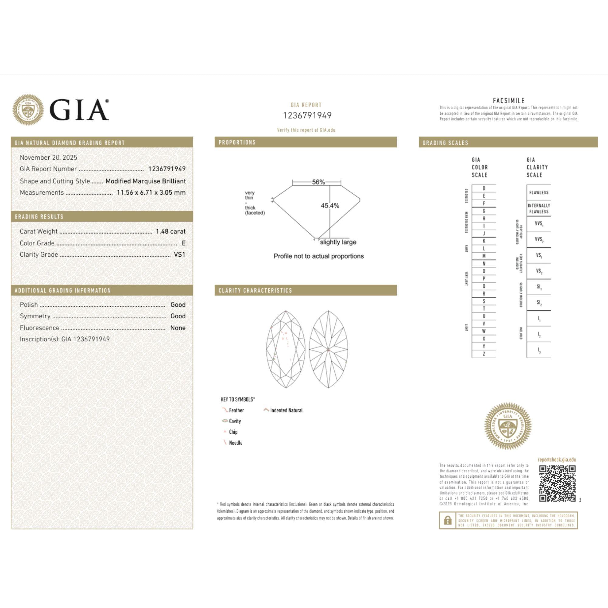 GIA-certified loose natural diamond featuring 1.48 carats in modified marquise cut, this unique cut is a mix of an oval and a marquise, otherwise known as a 'Moval-Cut' with E color and VS1 clarity. Good polish and symmetry grades with measurements 11.56 x 6.71 x 3.05mm, no fluorescence, certificate 1236791949 dated November 20, 2025.