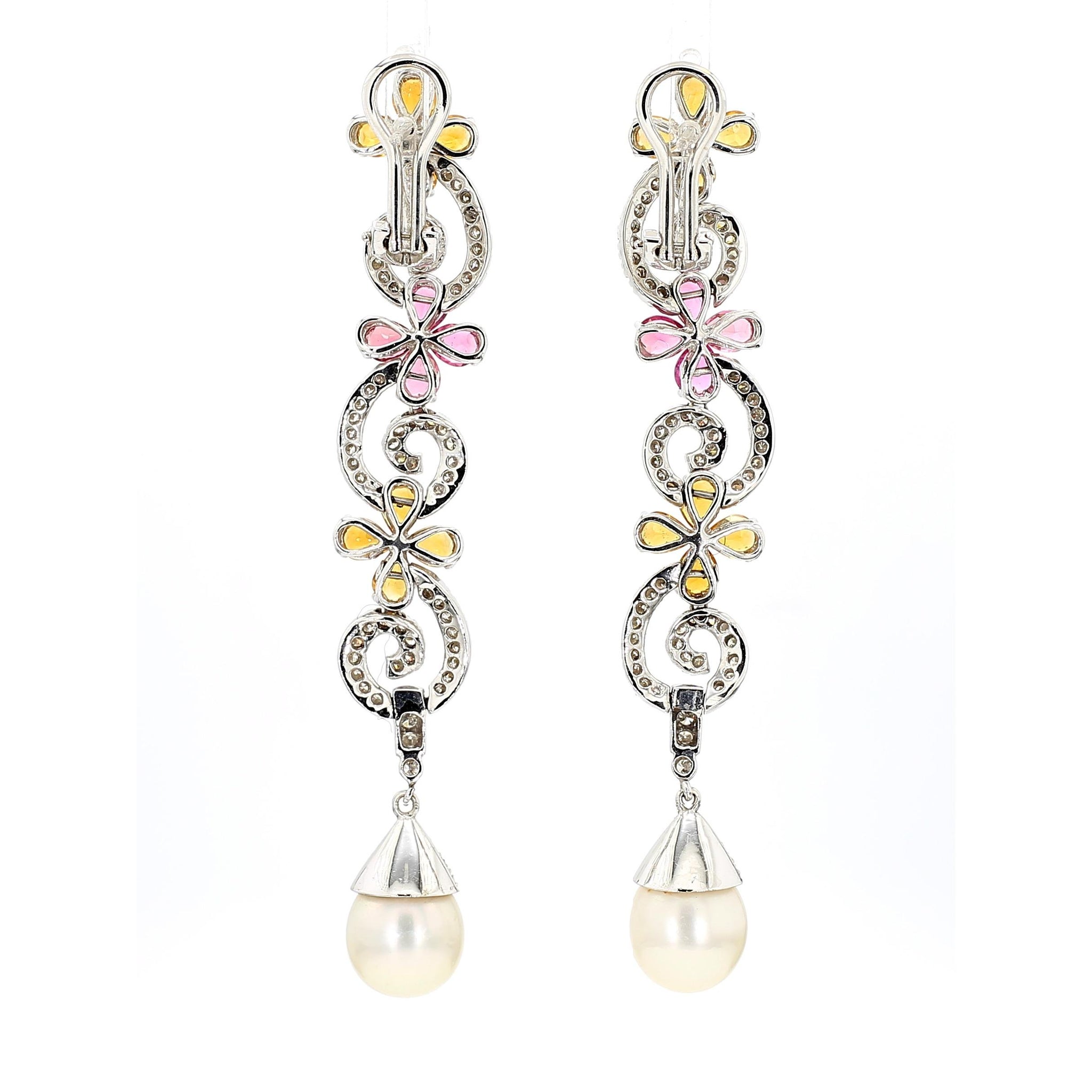 Intricate woven floral motifs create dimensional lattice patterns entirely pave-set with 12 carats of near-colorless E-F diamonds throughout both pieces, providing continuous sparkle and brilliance. The earrings feature graduated floral elements descending 3 inches, punctuated with alternating pink tourmalines and yellow garnets in prong settings, terminating in 11mm South Sea pearl drops that add elegant movement. The matching lariat necklace presents an 18-inch chain composed of interconnected floral links with 32 pink tourmalines and 32 yellow citrines strategically placed throughout, extending into a 3-inch adjustable lariat drop for versatile styling options. The 18K white gold construction provides neutral backdrop that enhances the pastel pink and warm yellow gemstone colors while the micro-pave diamond work creates texture and dimension across every surface.