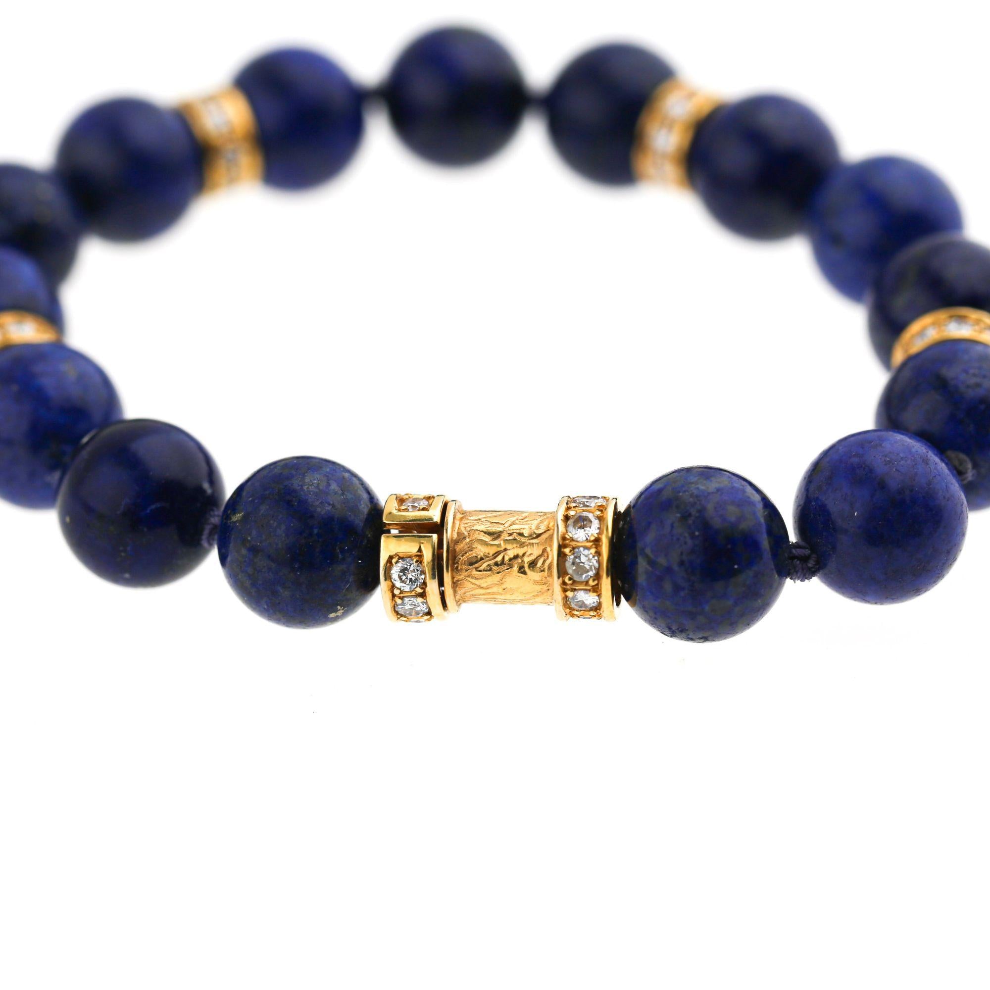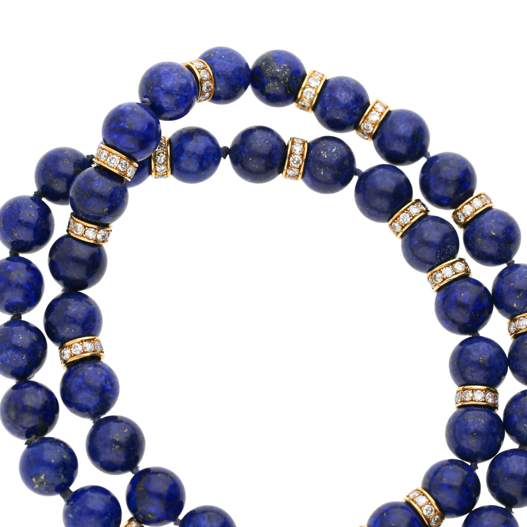 Lapis lazuli bead necklace and bracelet set in 18K yellow gold featuring polished round lapis beads with diamond-set rondelle spacers. Necklace with 45 lapis beads and 160 diamond rondelles measuring 23 inches, bracelet with 15 lapis beads and 52 diamond rondelles measuring 8 inches, total weight 184.51 grams.