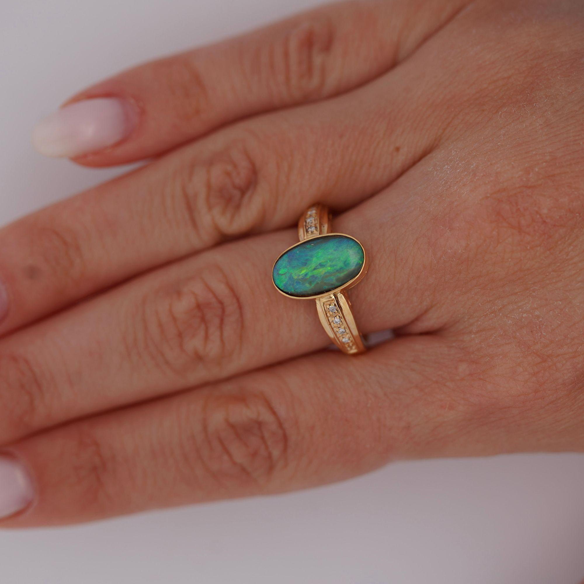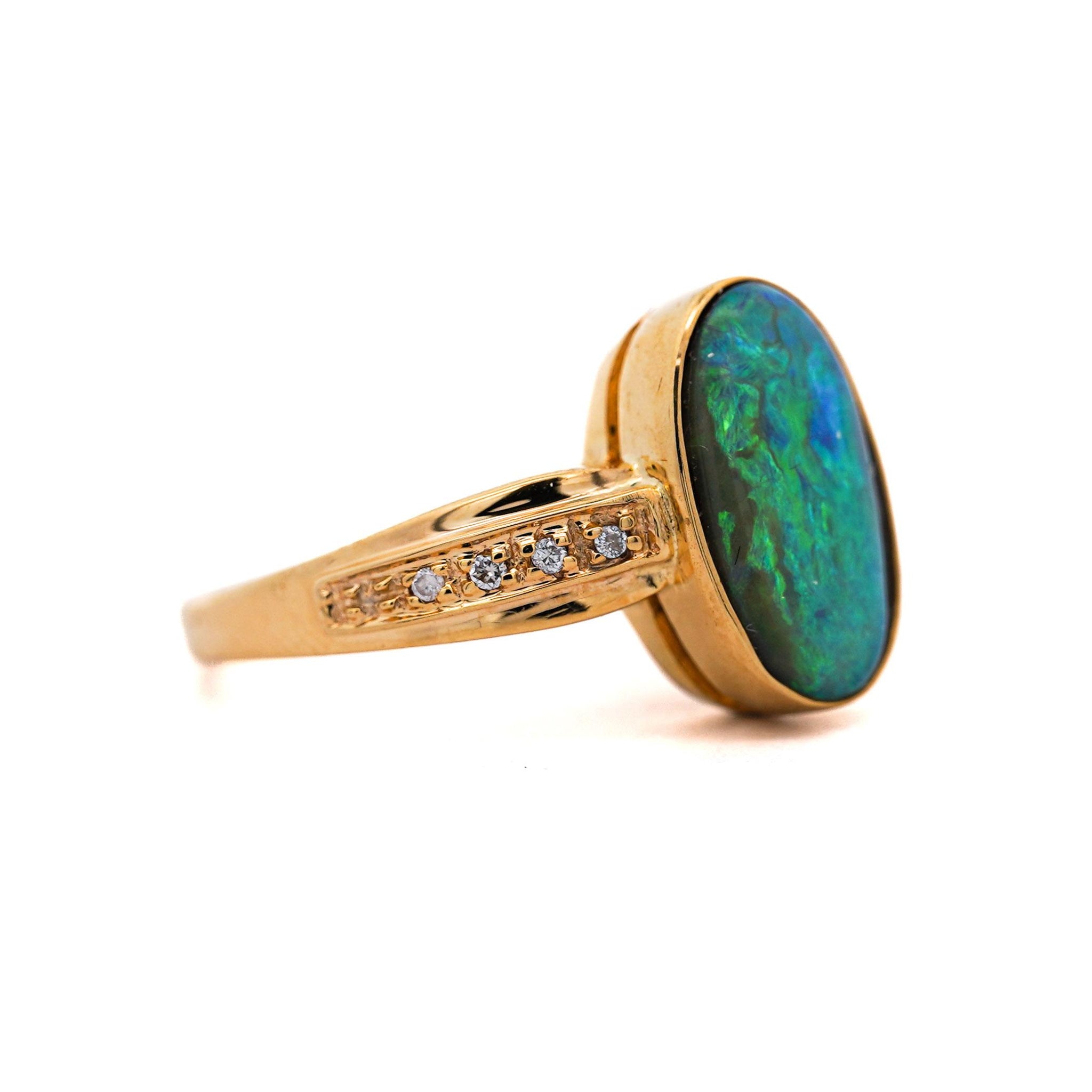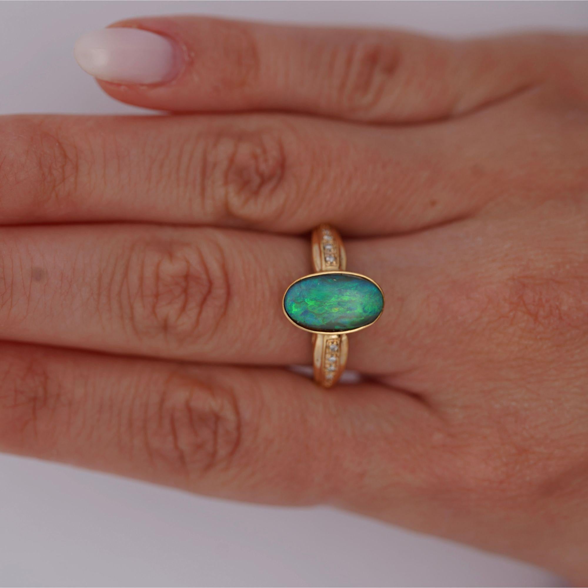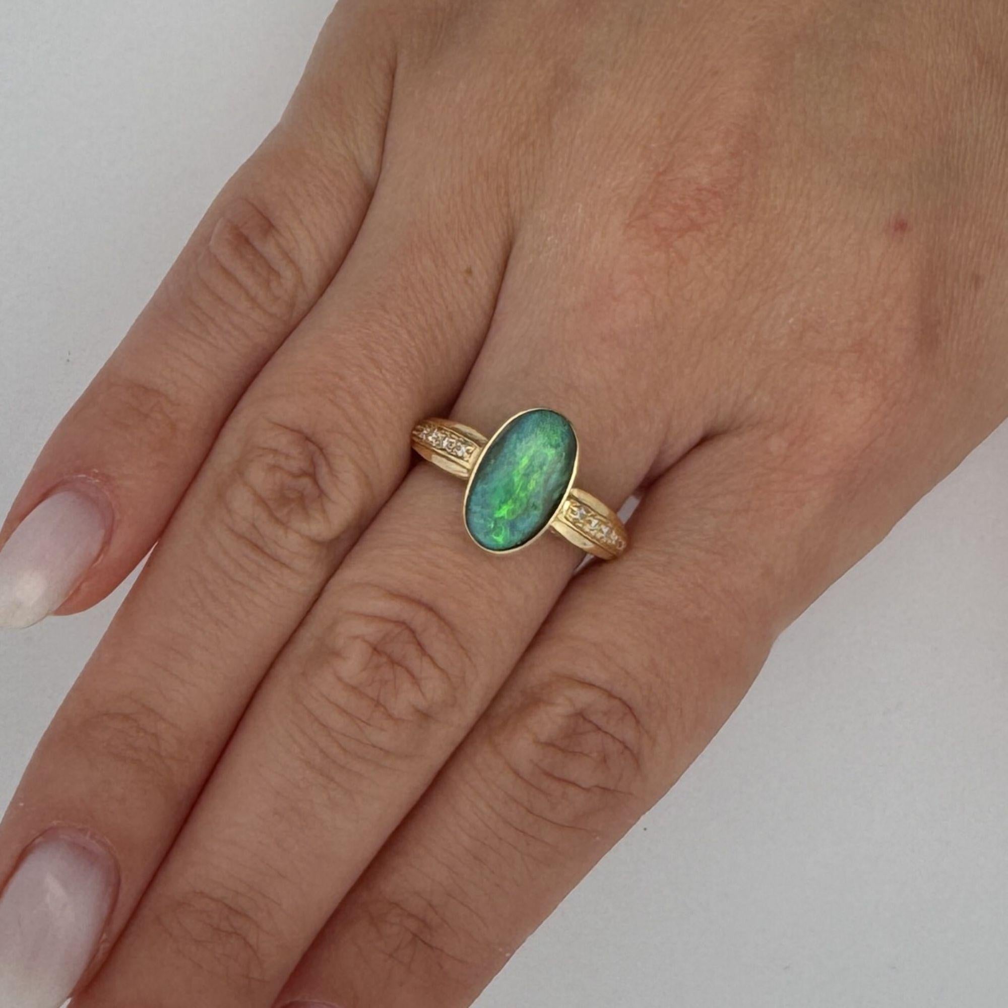 This black opal doublet displays vibrant green and blue play-of-color through its assembled construction, which combines thin natural opal with backing material to enhance color intensity and durability. The doublet construction allows for the stunning visual effects at a more accessible price point than solid natural opals. Eight carefully selected diamonds totaling 0.12 carats provide complementary brilliance while maintaining focus on the opal's unique optical phenomena.