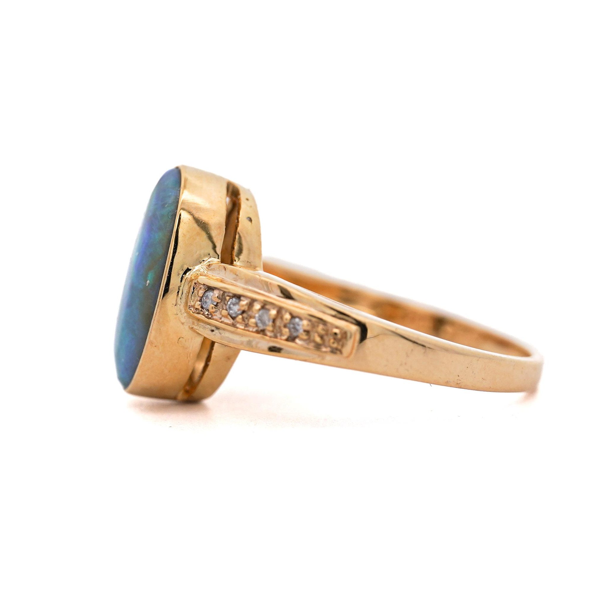 Natural black opal doublet and diamond ring in 18K and 14K yellow gold featuring bezel-set oval opal doublet measuring 13.4 x 8.3mm with diamond accent band totaling 0.12 carats. Size 7.5, adjustable, weighs 4.6 grams with a smooth bezel setting.