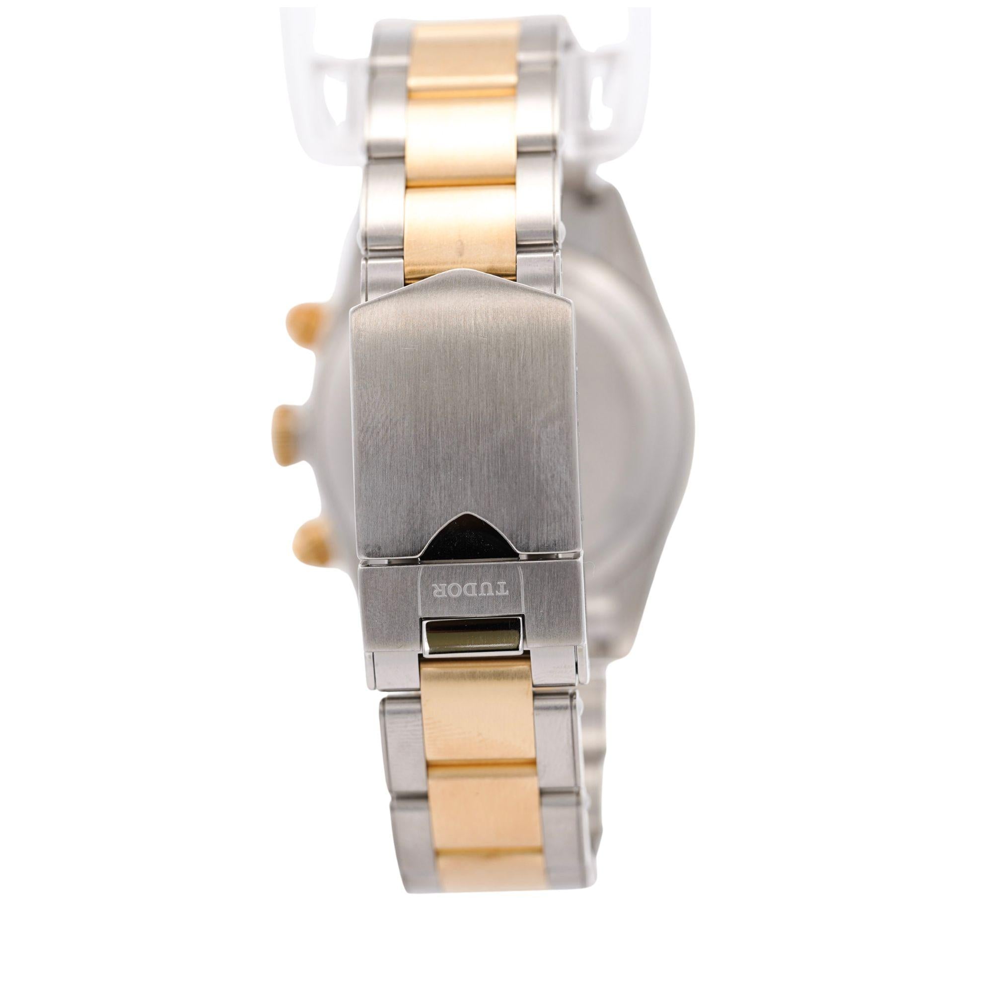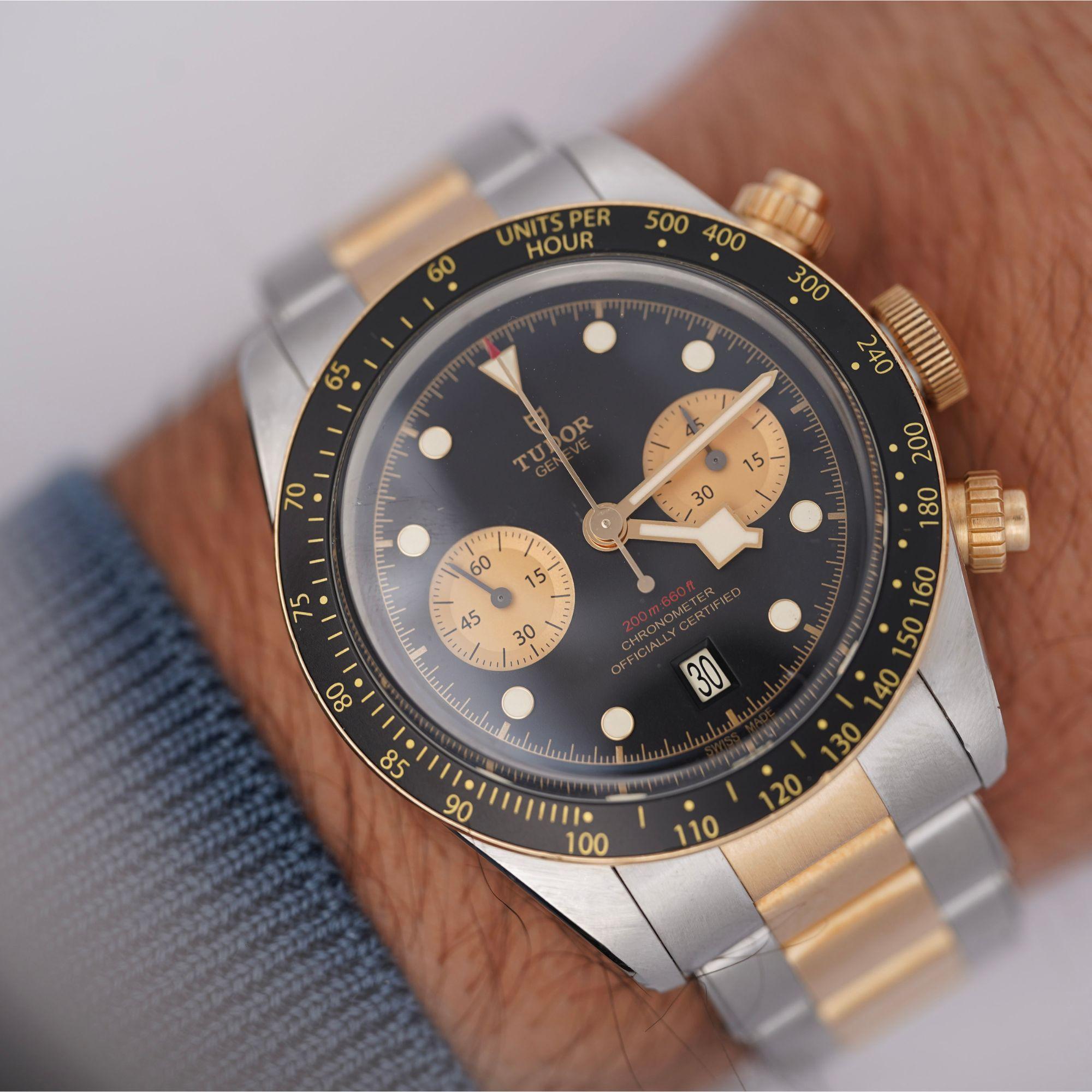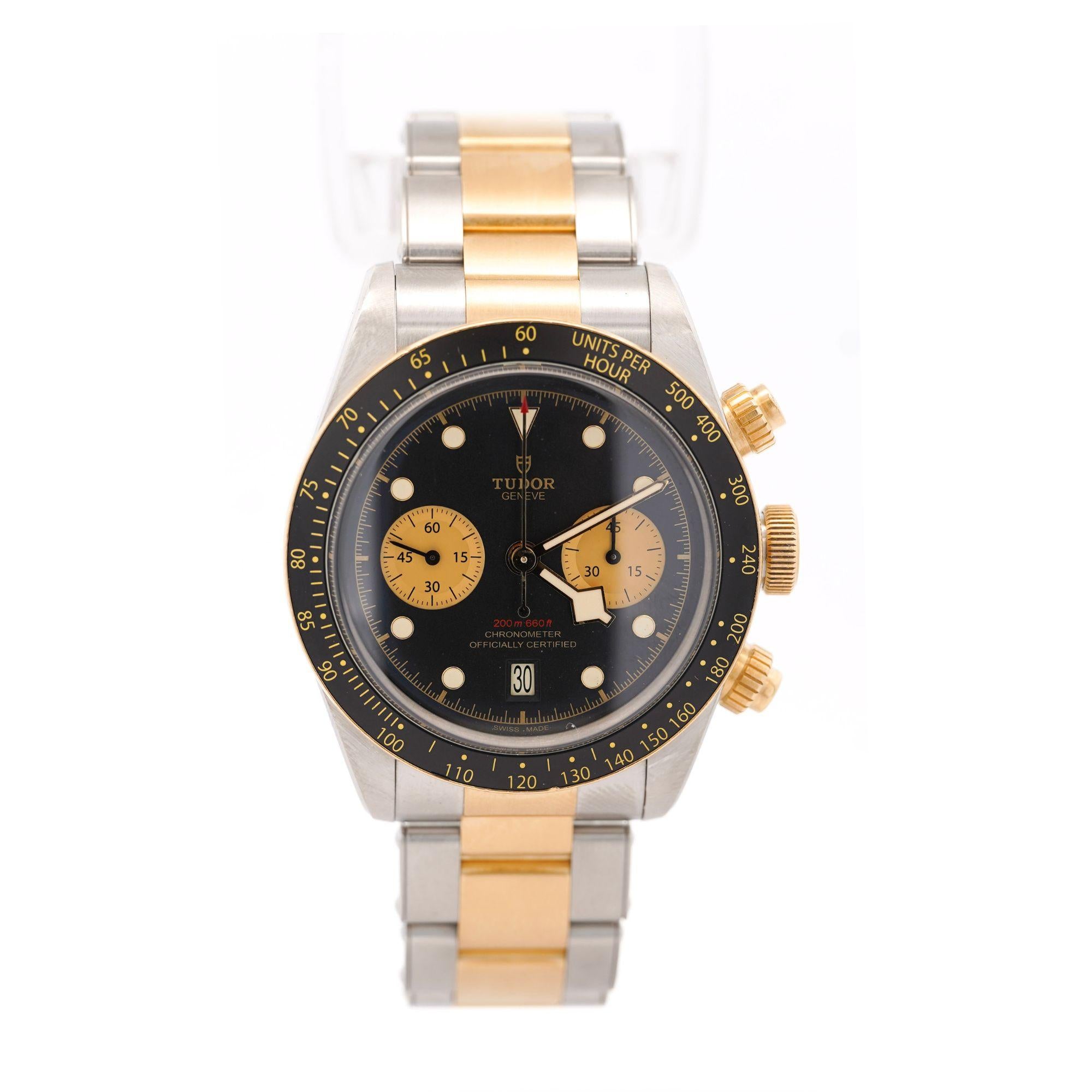 The Tudor Black Bay Chrono Steel and Gold reference 79363N is Tudor's flagship chronograph, pairing the brand's beloved Black Bay sports architecture with 18K yellow gold pushers, crown, bezel frame, and alternating bracelet links — creating a two-tone composition that is as functional as it is visually commanding. The black dial with contrasting champagne gold sub-dials at 3 and 9 o'clock creates a bold panda-style contrast that references racing chronograph design from the 1960s and 1970s, while the red-tipped seconds hand and red water resistance text add subtle but purposeful color accents that animate the dial. The black enamel tachymeter bezel with yellow gold numerals and scale is one of the most distinctive bezel designs in contemporary watchmaking, giving this reference an immediately recognizable identity on the wrist that few sport watches can match.
