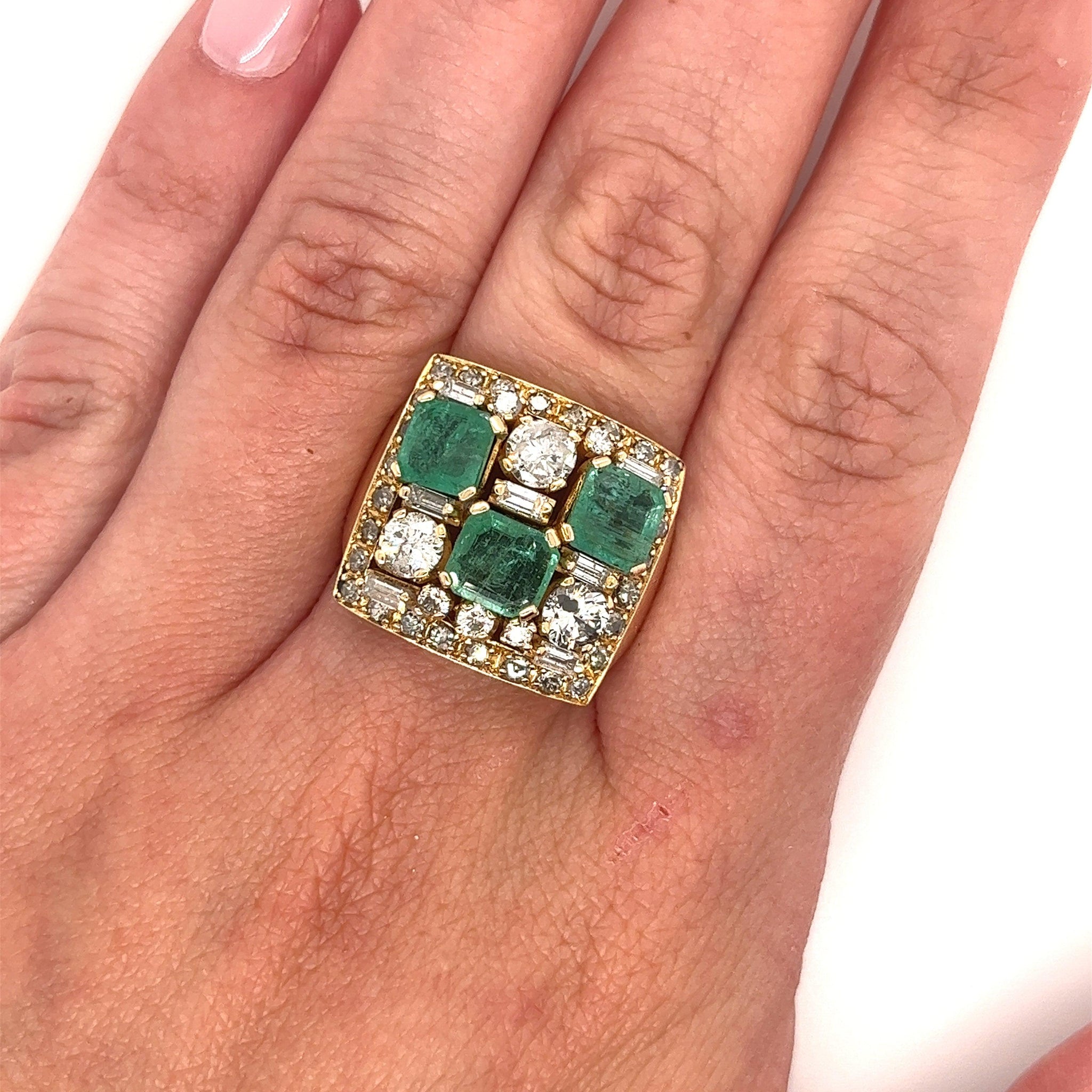 Vintage art deco inspired ring and earring set. Mounted with 12 carats in square cut natural emeralds and over carats in baguette and round cut diamonds. Beautifully sorted with the quintessential symmetrical art deco pattern. A stunning array of colors and congruity form this one of a kind vintage masterpiece.
