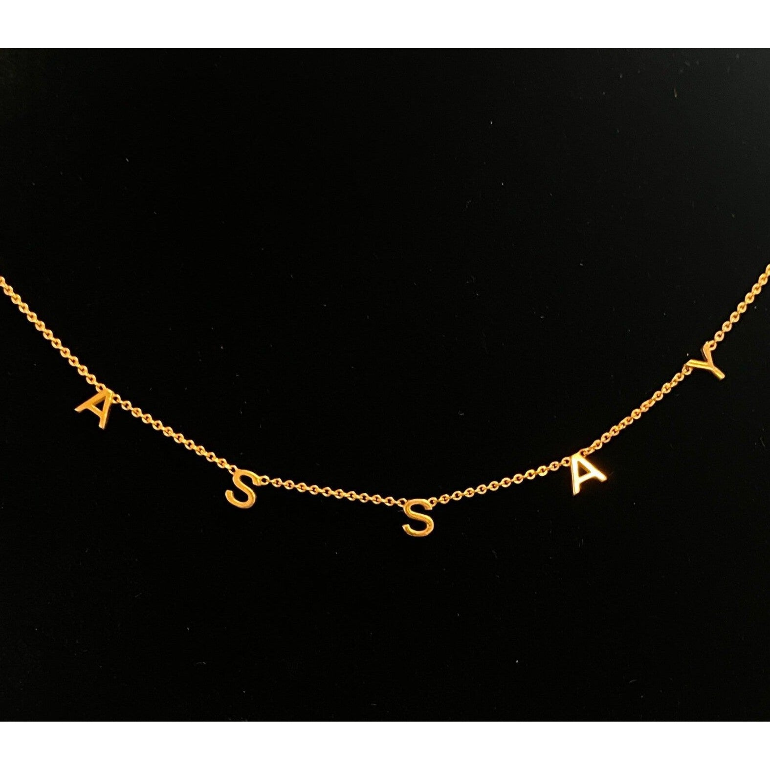 Personalized custom letter name necklace in 14 karat solid gold. Letters are integrated into an 18-inch, 1MM, cable chain with lobster closure. 20mm gap between letters and each letter is approximately 5 by 4mm.