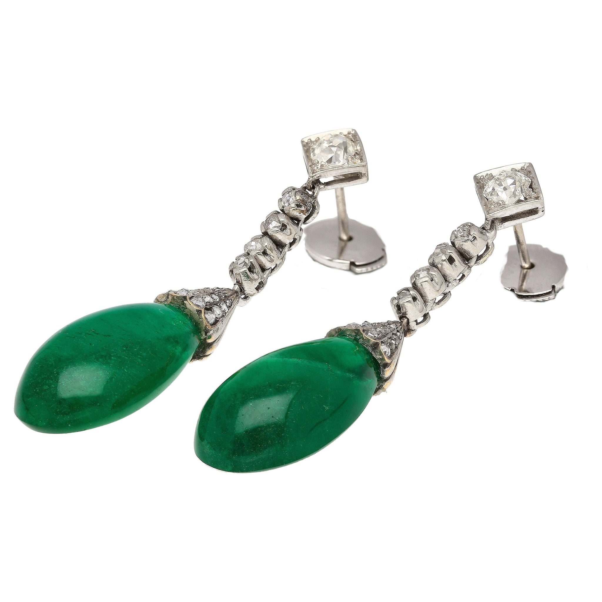 Vintage Art Deco Zambian Emerald and diamond drop earrings in 18k white gold. These earrings are 100% vintage, with all parts and pieces of original Art Deco circa 1940.